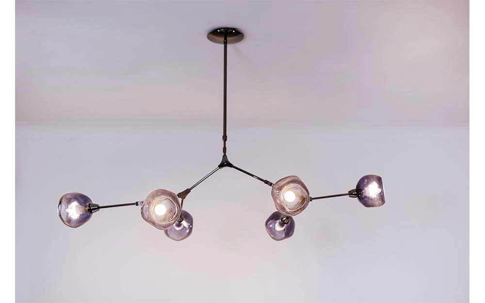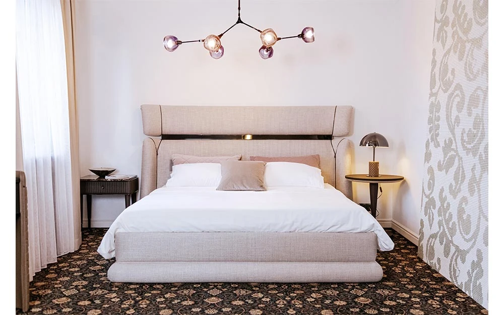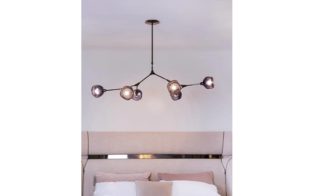 2. Спалнята е осветена от изключително осветително тяло Attanasio, изработено от опушено ръчно стъкло в неправилна форма и графична метална конструкция във финиш от черен хром.