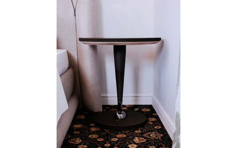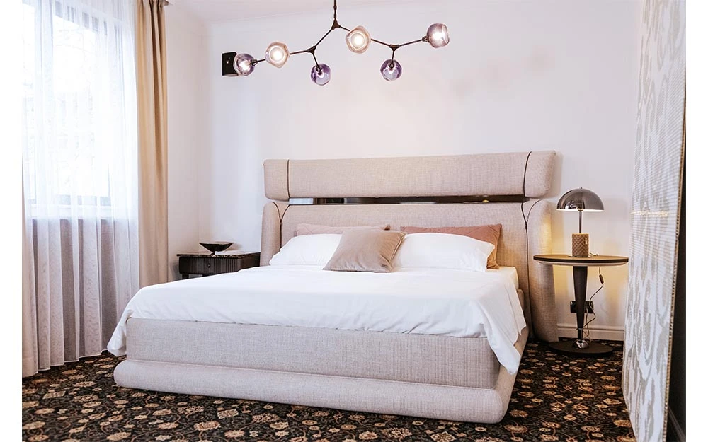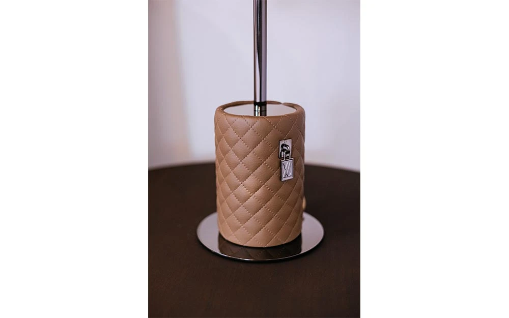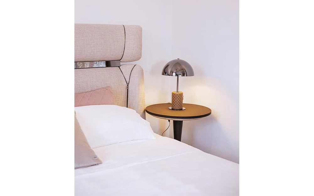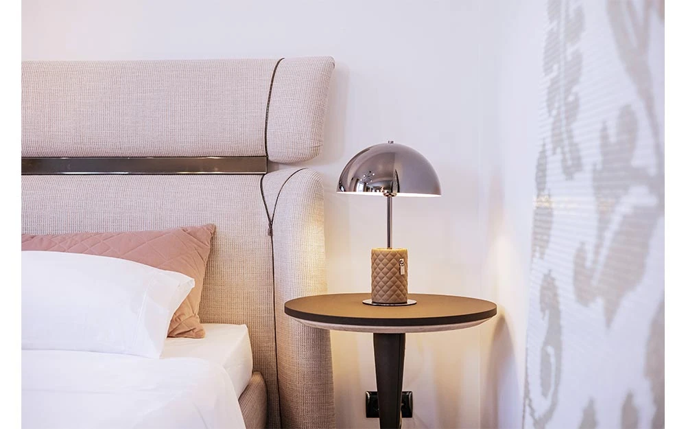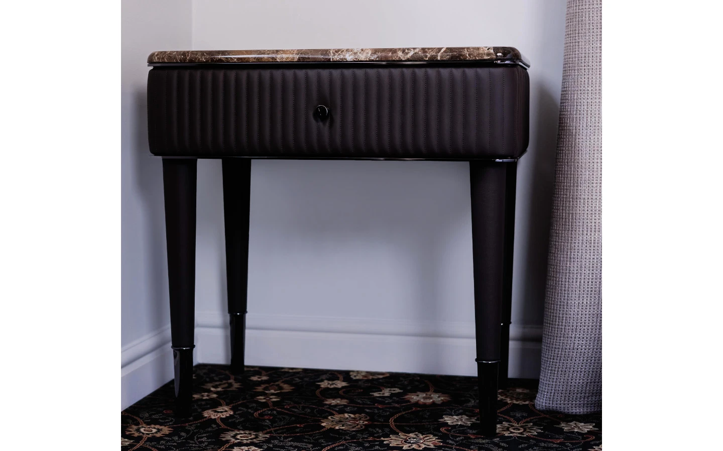 3. Съчетахме спалнята с нощно шкафче Augusta в естествена кожа с раиран капитонаж и мраморен плот от едната страна и със странична масичка Teo с фина структура, метален акцент и крак облечен отново в кожа. На нощната масичка поставихме настолна лампа Odo Thin с основа от естествена кожа с ромбоиден капитонаж и шапка и структура в черен хром.