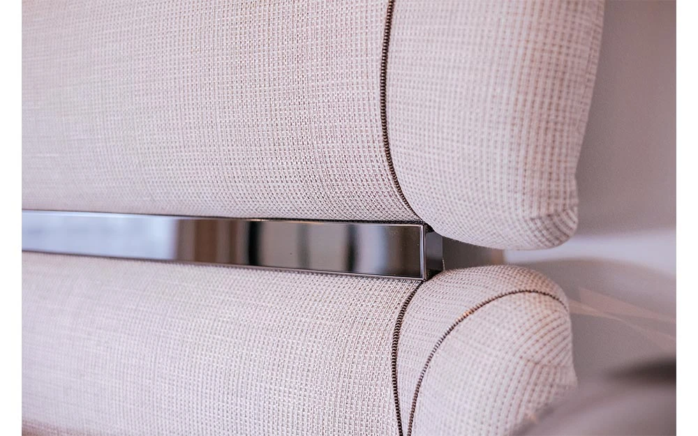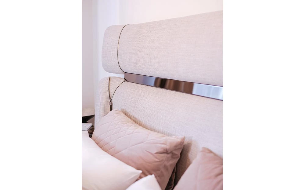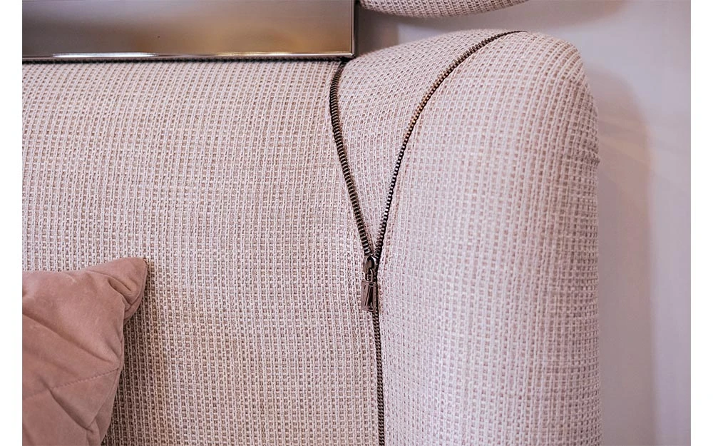 1. Annabel е спалнята, която избрахме да представим в нашия шоурум, заради перфектната си геометрия, ексклузивни метални детайли и декоративните ципове. Спалнята може да бъде произведена в богатство от тъкани. Нашият избор е комбинация от структурна коприна в светъл пясъчен тон и метални детайли в контрастен черен хром.