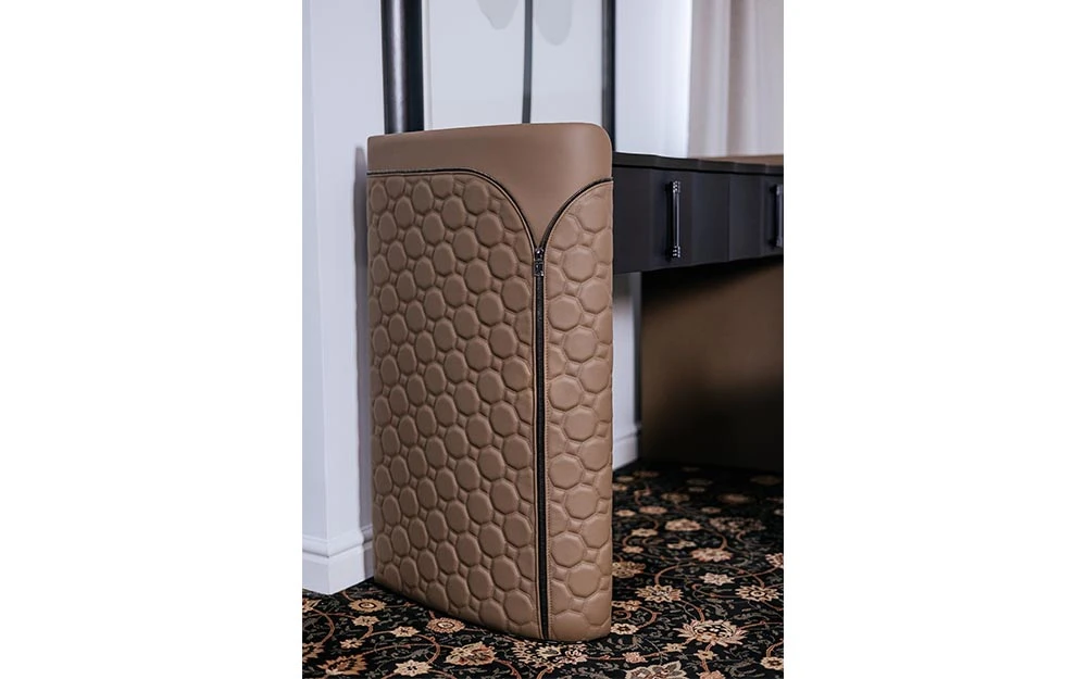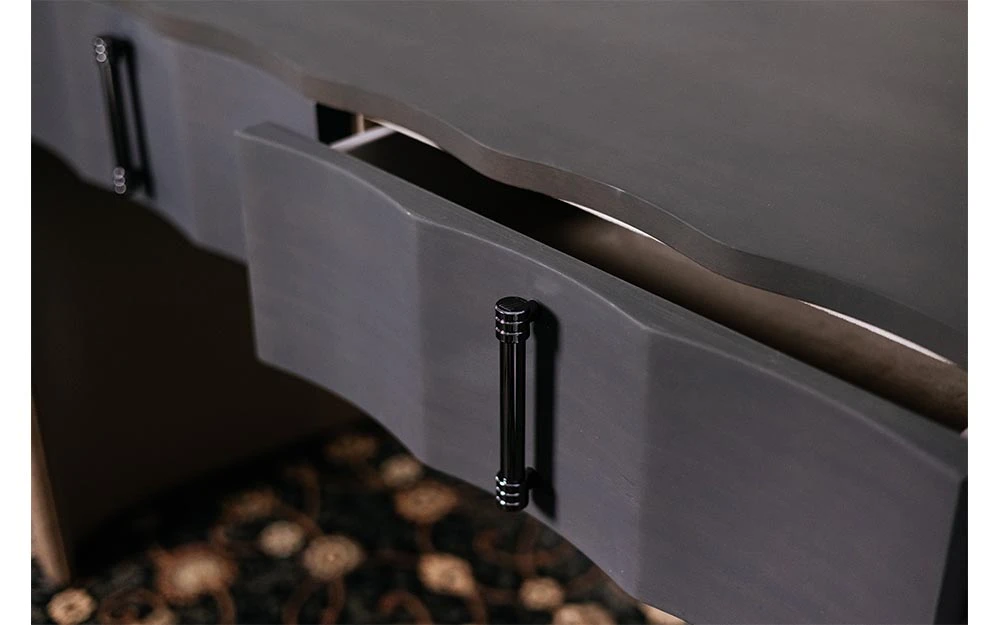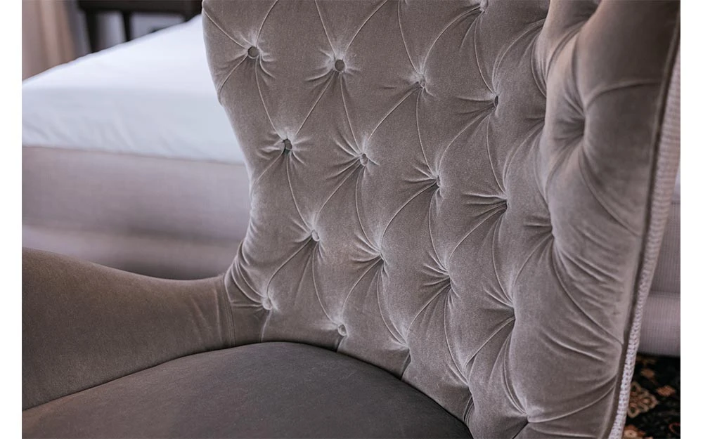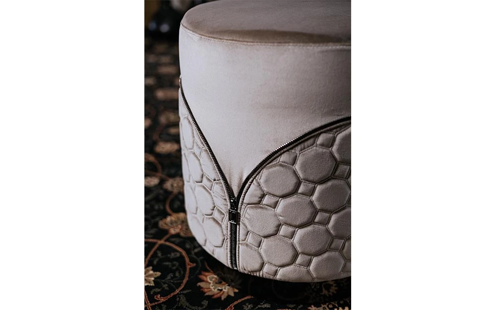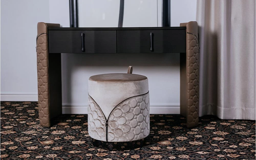 4. Допълнихме къта на спалнята с тоалетка Mason с меки заоблени форми. Тоалетката е характерна с декоративните ципове, които са елемент от спалнята, ексклузивни капитонирани страници и чекмеджета, които допълват и подчертават цялата композиция. Пред тоалетката поставихме табуретката Bill. Тя е с метална основа и декоративни ципове в черен хром и плюш с красив капитонаж.