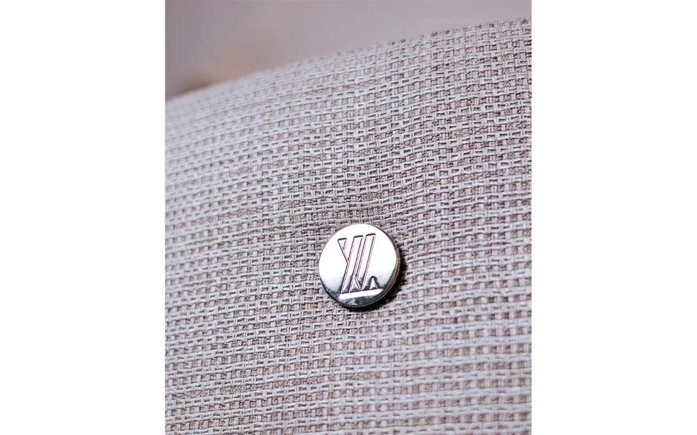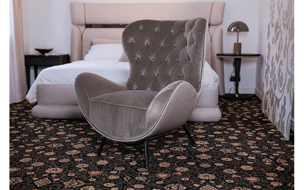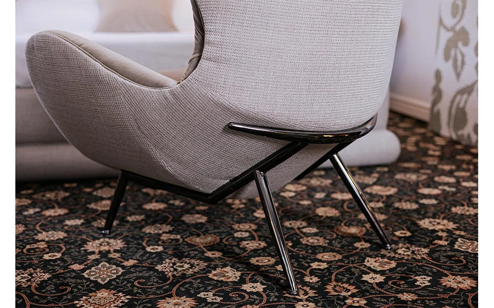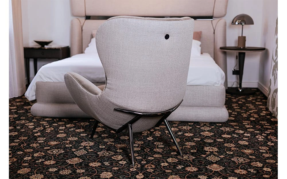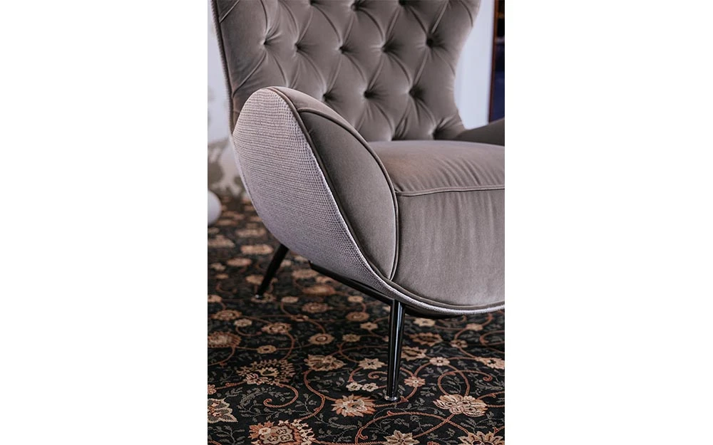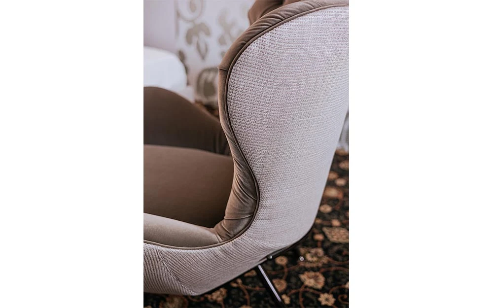 5. Креслото Marion е завършващият екстравагантен щрих в общата композиция. Комфортен и красив, фотьойлът е изпълнен в структурна коприна, съчетана с плюш. Двете благородни материи са в светъл пастелен и дълбок пясъчен тон. За графичната основа на фотьойла избрахме отново черния хром.