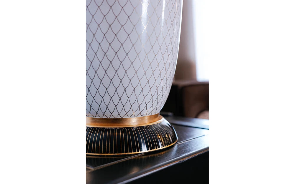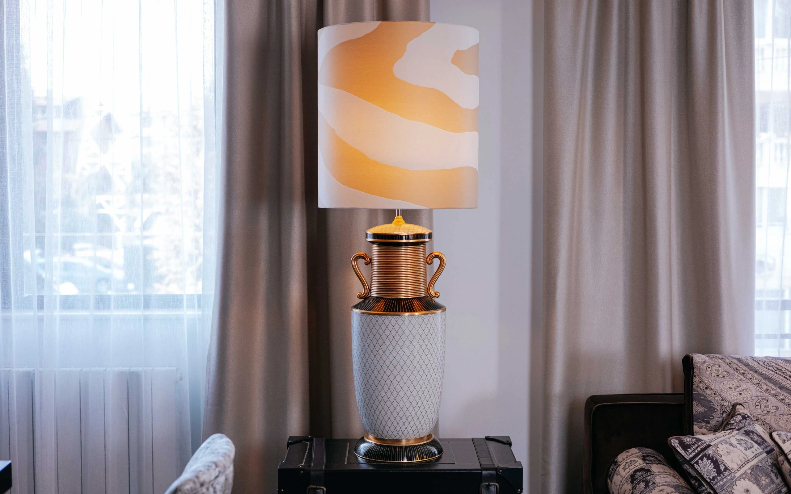 Настолна лампа AFRICA от колекцията на испанския производител COLECCION ALEXANDRA. Керамична основа с декоративни елементи в златно и черно. Шапка с мотив зебра.