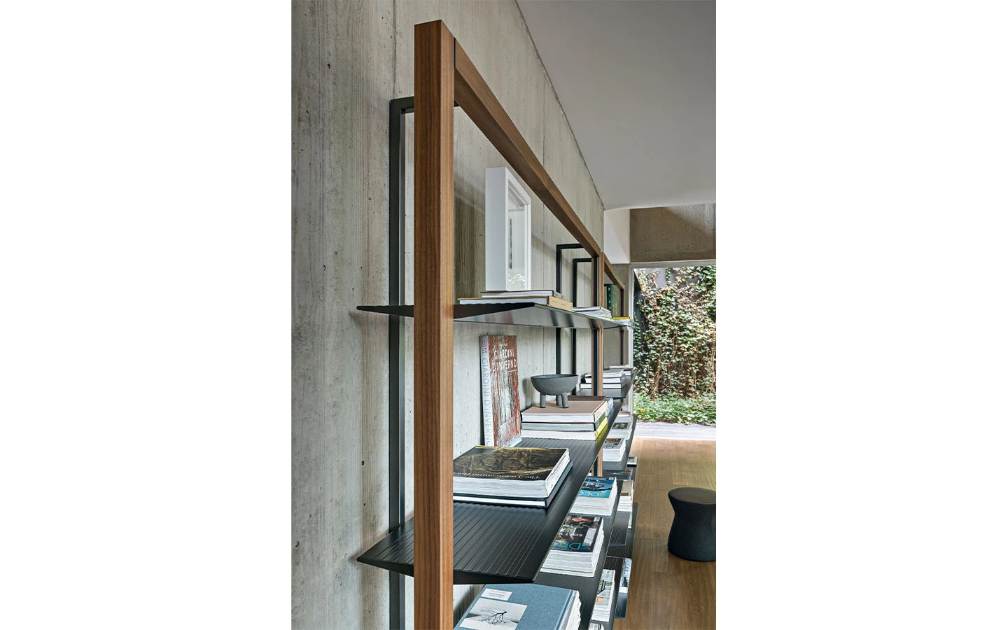 Внимателният избор на материали е в основата на тази библиотека. Алуминий – материал, който прави структурата оптически лека, в съчетание с топлината на дървото, което е главният герой в библиотеката ALIX.