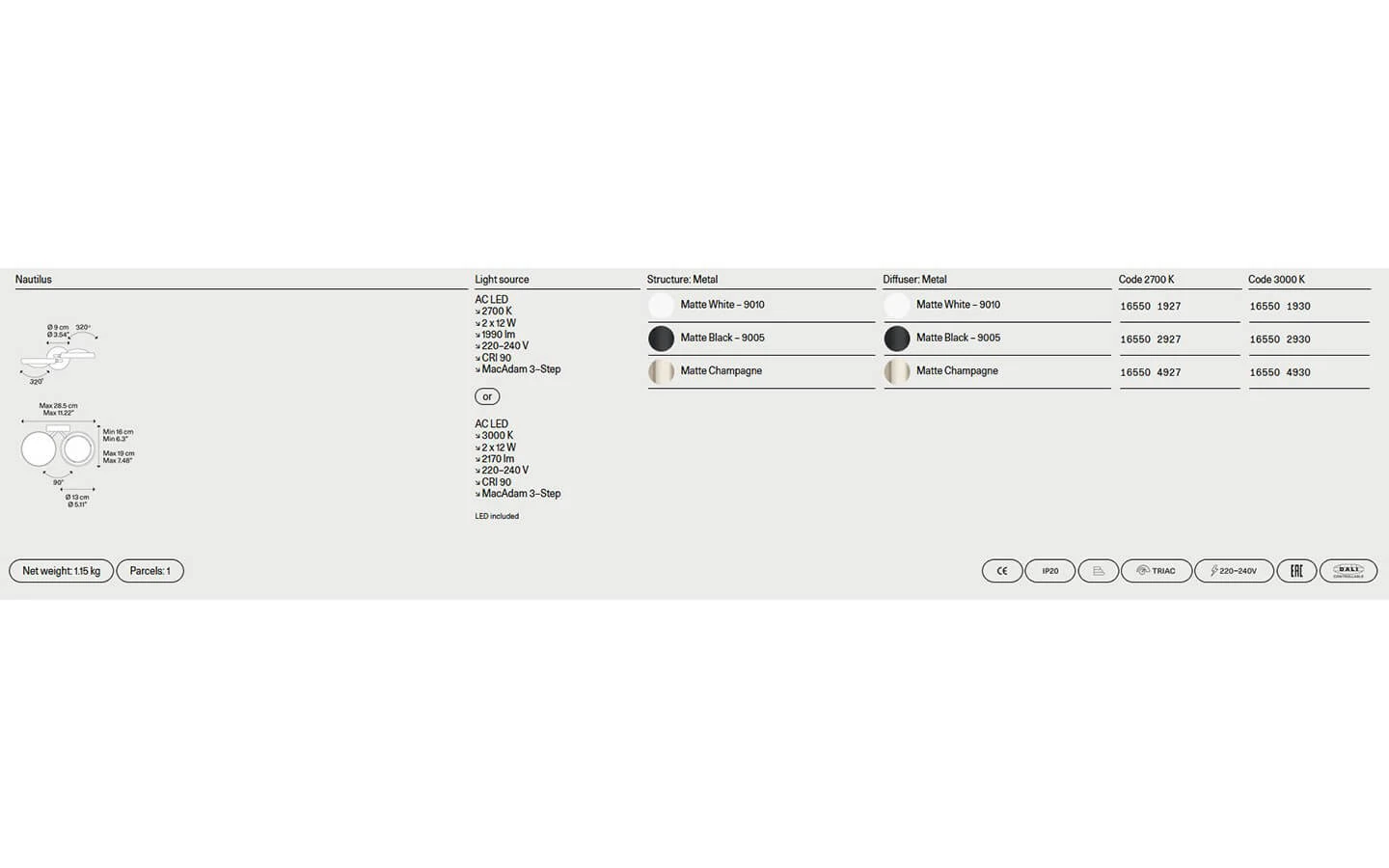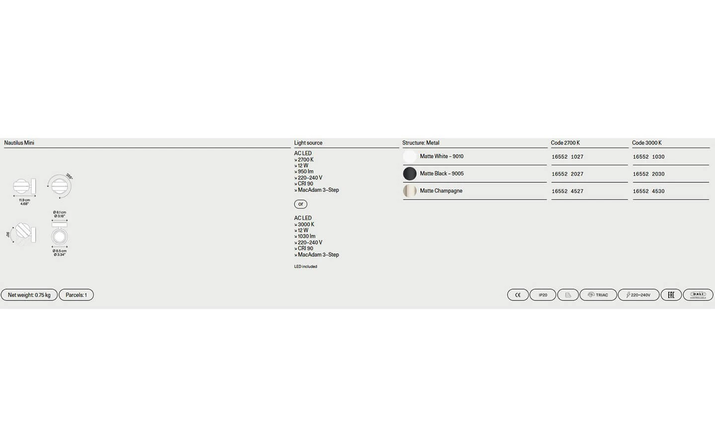 Посочената цена е за аплик Nautilus Mini в начална категория финиш на метала за структурата.