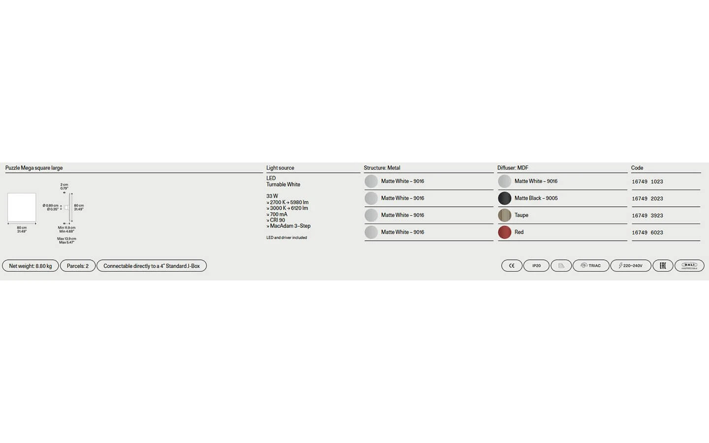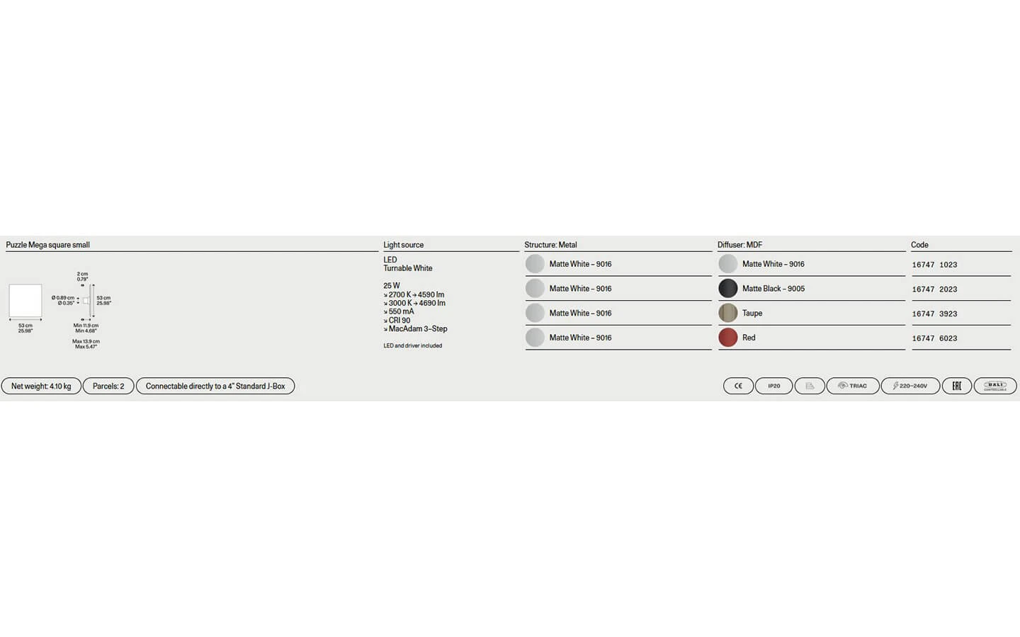 PUZZLE MEGA е аплик от колекцията на италианския производител LODES. Апликът се предлага в квадратна и кръгла форма – по избор на клиента. Структурата е изработена от метал – финиш Matte White. Дифузерът е изработен от MDF – финиш по избор. Цената се определя спрямо избора на размер и финиш на MDF материала при дифузера.