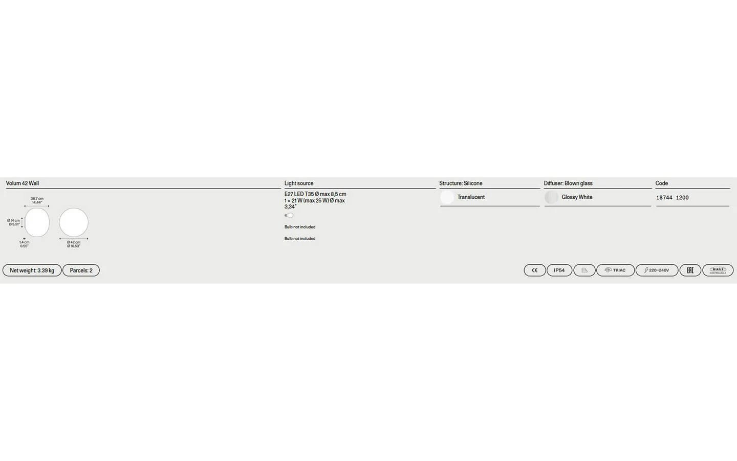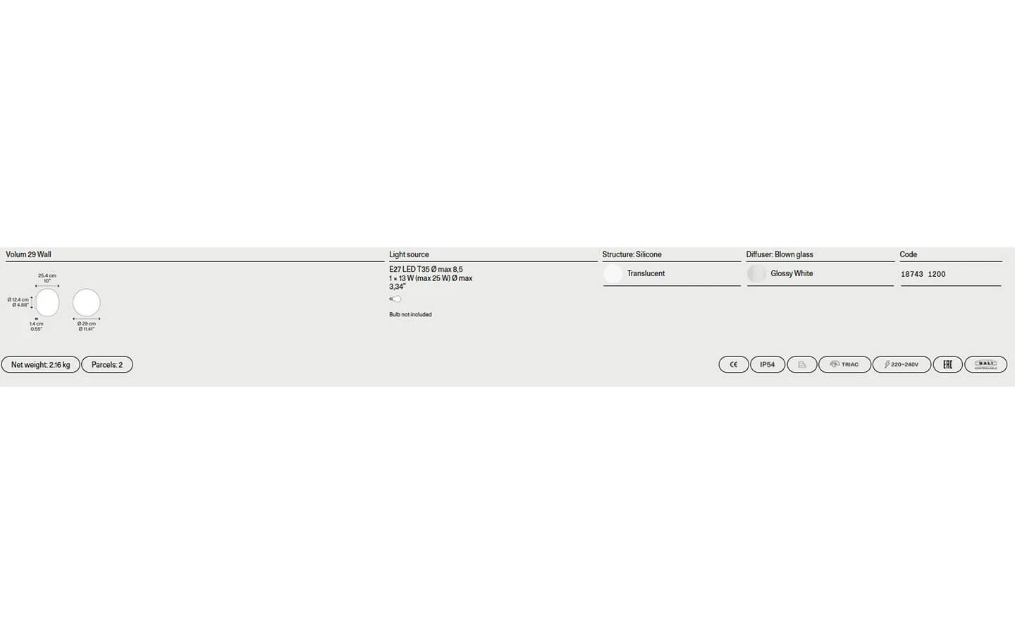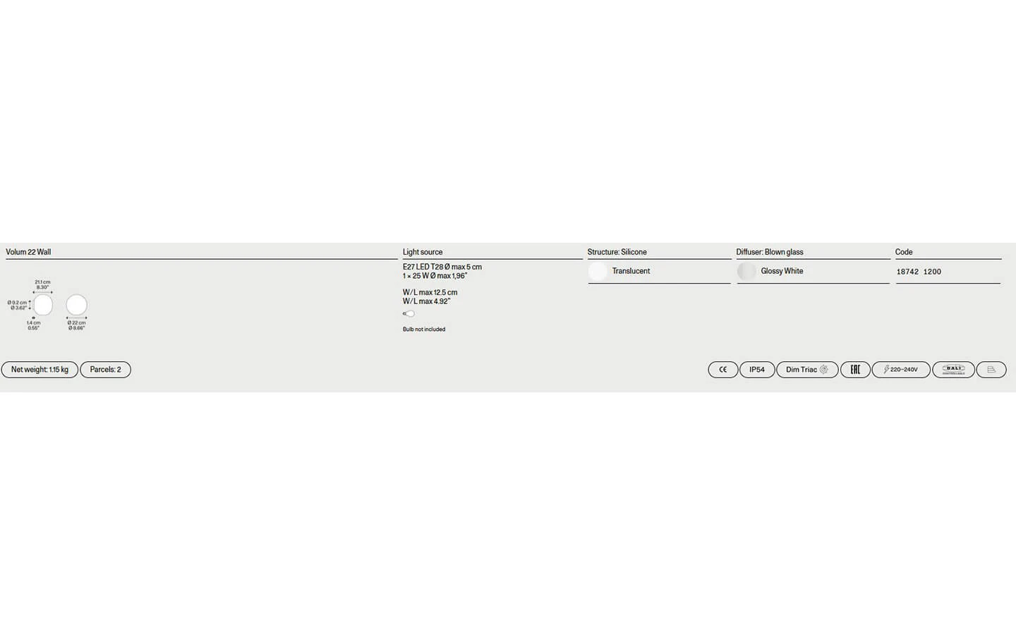 VOLUM от LODES е елегантен аплик с мека, органична форма, част от колекцията Volum, създадена в сътрудничество със студио Snøhetta. Дизайнът се отличава със сферичен дифузер от духано стъкло с бял гланцов финиш, който разпръсква светлината равномерно и създава деликатно, атмосферно сияние около себе си. Благодарение на своята изчистена геометрия и балансирани пропорции, моделът придава усещане за спокойствие и хармония в пространството. Осигурява мека и комфортна светлина с висока цветопредавателна способност, подходяща както за коридори и спални, така и за дневни или обществени интериори. VOLUM е аплик, който съчетава традицията на майсторското духано стъкло с модерна технологична прецизност, превръщайки се в изискан светлинен акцент в съвременния интериор.