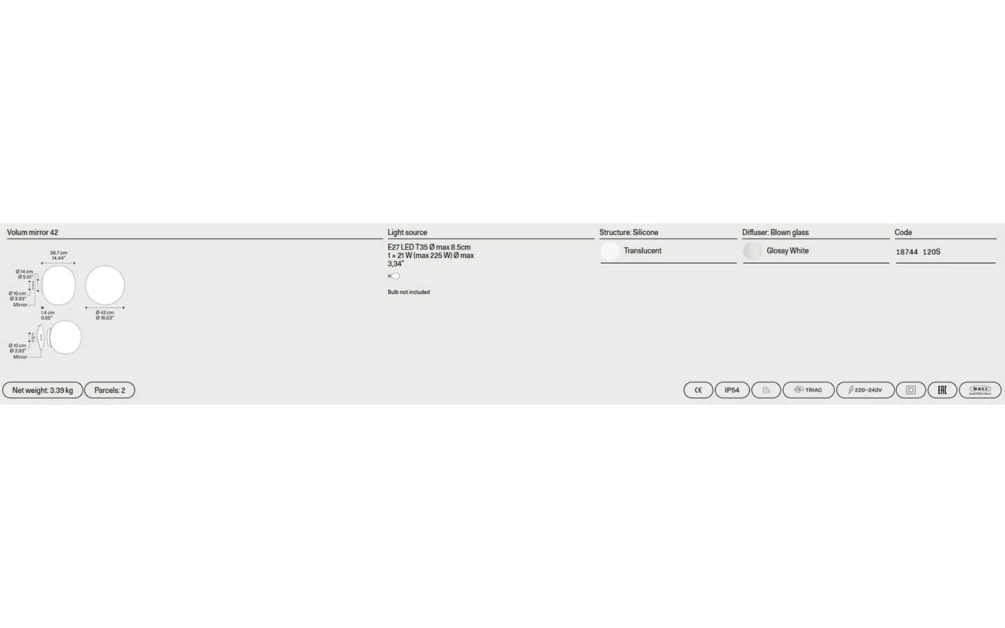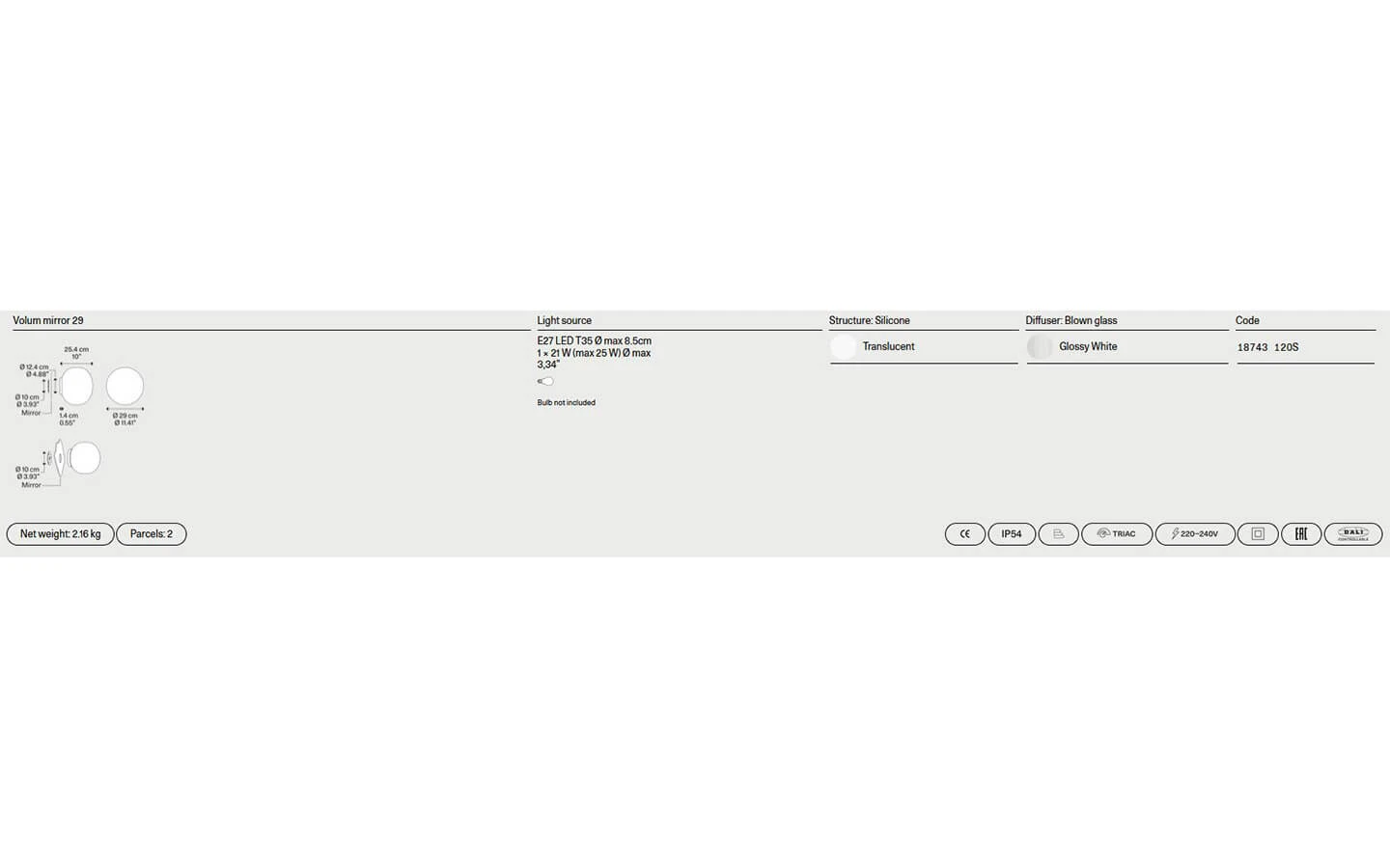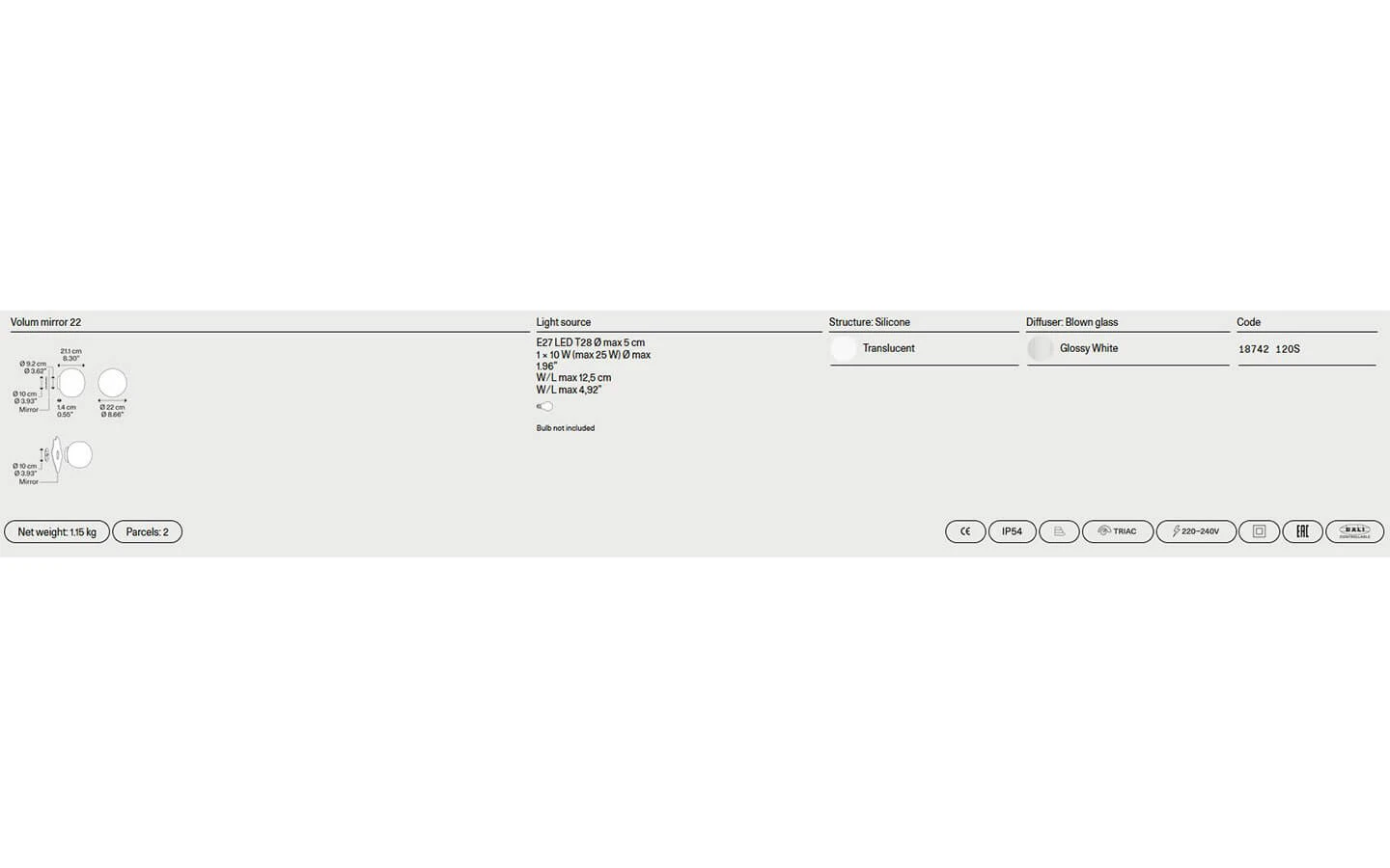 VOLUM е аплик от колекцията на италианския производител LODES. Дифузерът е изработен от ръчно духано стъкло – финиш Glossy White. Апликът VOLUM се предлага във две версии – за монтаж към стена или за монтаж върху огледало. Цената се определя спрямо избора на размер и вид монтаж.
