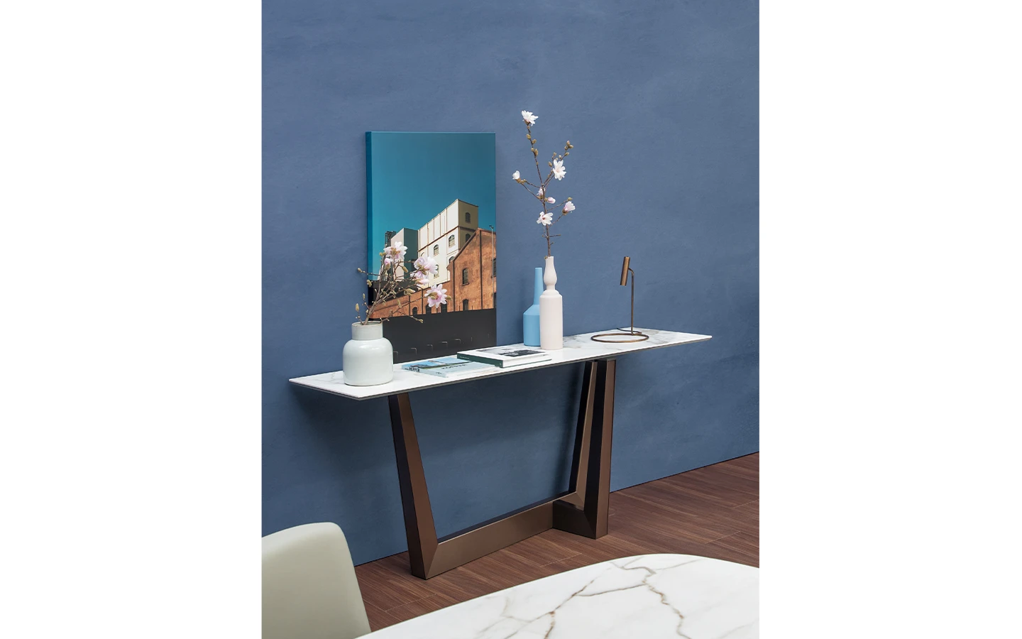 ART CONSOLE е италианска конзолна маса от колекцията на италианския производител Bonaldo. Основата на конзолната маса е изработена от метал – голямо разнообразие от финиши по избор на клиента. Плотът може да бъде от естествен фурнир, керамика, или естествен мрамор- разнообразие от финиши по избор на клиента. Цената на конзолната маса се формира на база на избора на вид плот и финиш на основата.