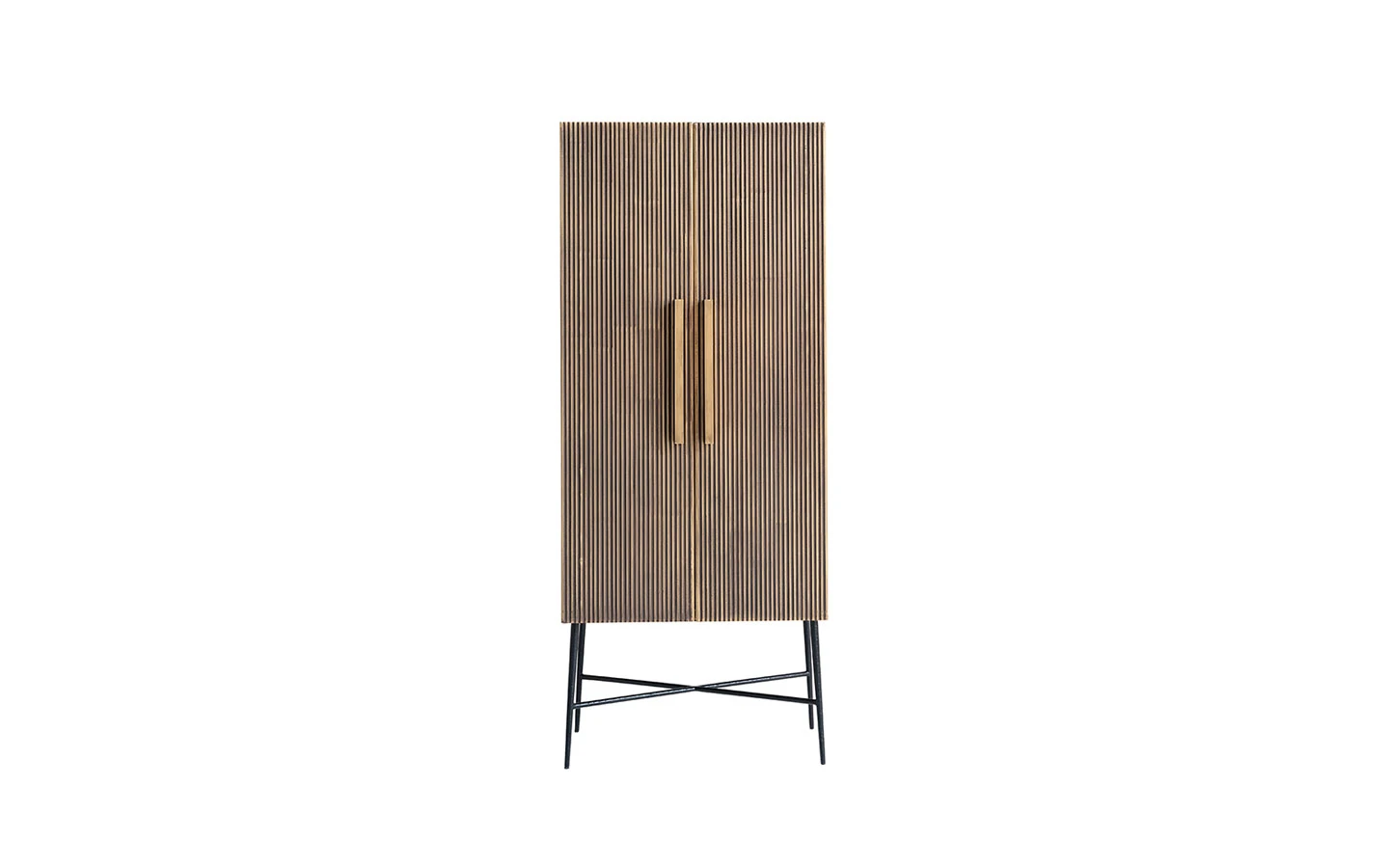 Бар шкафът IRONVILLE 2-DOORS от Richmond Interiors е впечатляващо съчетание от артистичен дизайн и функционалност, което придава уникален характер на всяко пространство. Изработен от висококачествени материали като метал и MDF, този шкаф се отличава с изискано златно покритие и оребрени детайли, които създават визуална дълбочина и естетическо въздействие. Шкафът стои върху елегантни черни метални крака, които допълват съвременния му вид. Зад двете врати се крие просторен вътрешен обем с рафтове, идеален за съхранение на различни предмети – от посуда до декоративни елементи. IRONVILLE 2-DOORS е идеален избор за тези, които търсят мебел, съчетаваща елегантност, функционалност и уникален дизайн.