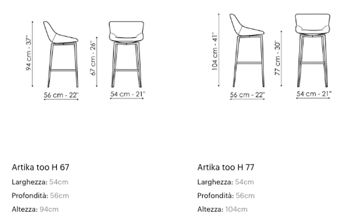 ARTIKA TOO е италиански бар стол от колекцията на италианския производител Bonaldo. ARTIKA TOO може да бъде тапициран в дамаска, еко кожа или кожа – материал и цвят по избор на клиента. Краката са изработени от метал – финиш по избор на клиента. Цената на стола се формира на база на избора на тапицерия и размер.