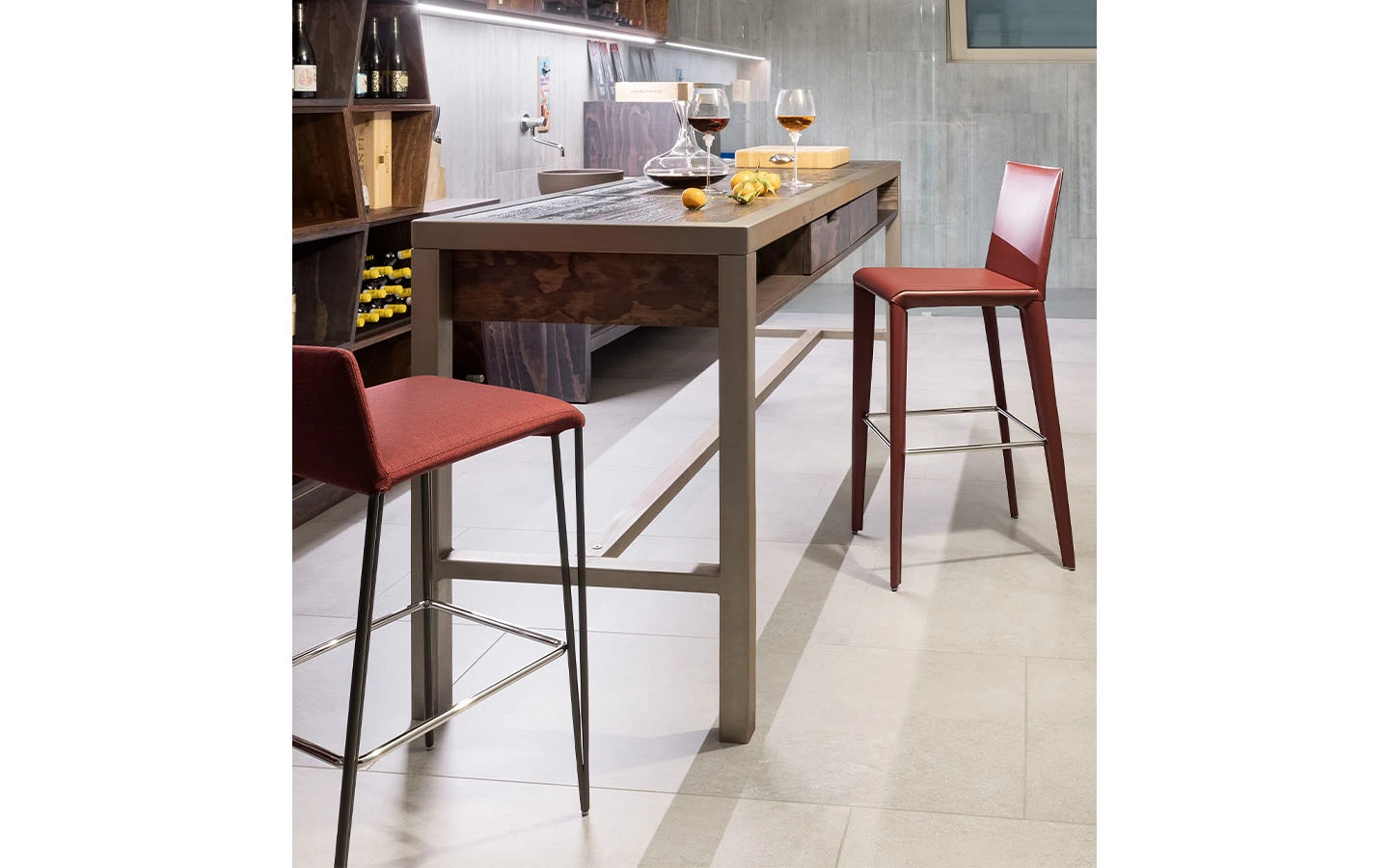 FILLY TOO се предлага в два различни размера и във варианти с ниска облегалка (FILLY TOO) или висока облегалка (FILLY UP TOO). Този бар стол може да отговори на нуждите за функционалност и комфорт на всеки клиент. Във версията, изцяло тапицирана с дамаска, кожа, еко-кожа или естествен гьон, той показва по-небрежен вид. Вместо това, разкрива по-динамичен вид във варианта с височина 65 см, при който се виждат оригиналните метални крака.