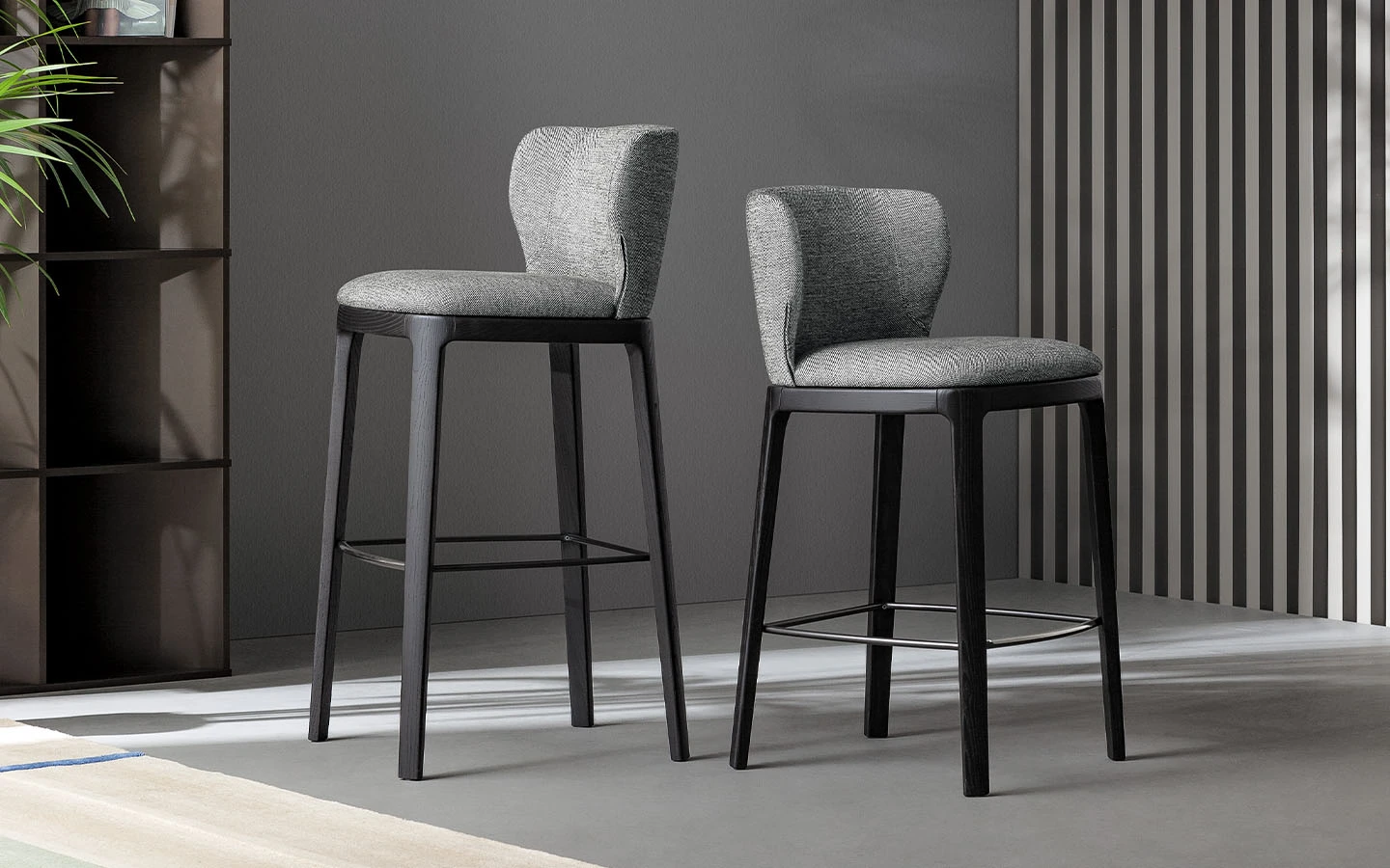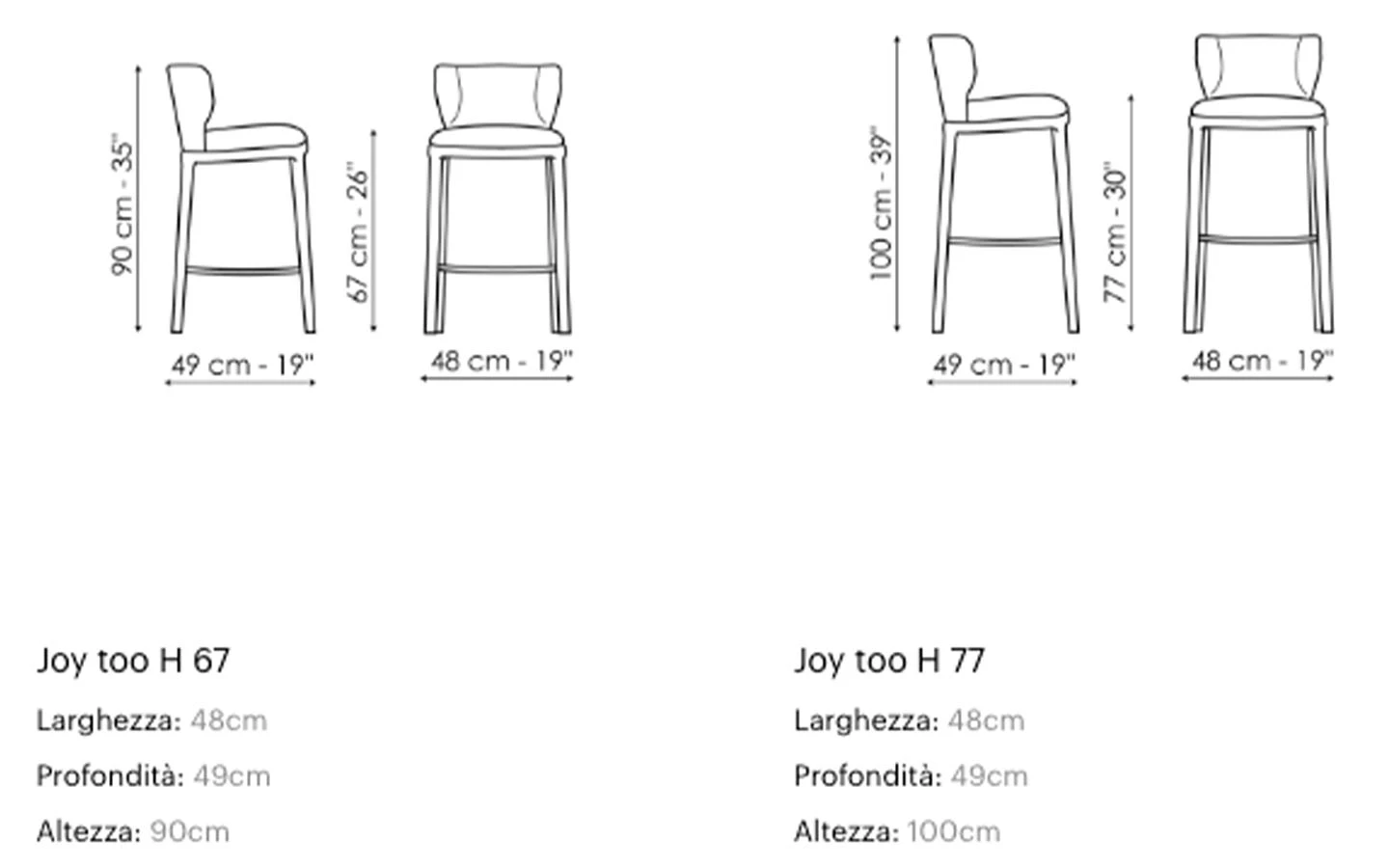Колекцията от столове JOY внася елегантност и уют. Масивното дърво на основата контрастира с меките контури на обгръщащата и уверено оформена седалка и облегалка, изработени от дамаска, еко-кожа или кожа. JOY TOO е бар стол, който допълва колекцията от изискани и удобни столове с изразена индивидуалност, които, благодарение на персонализираните покрития и цветове, са идеално подходящи както за жилищни, така и за обществени пространства.