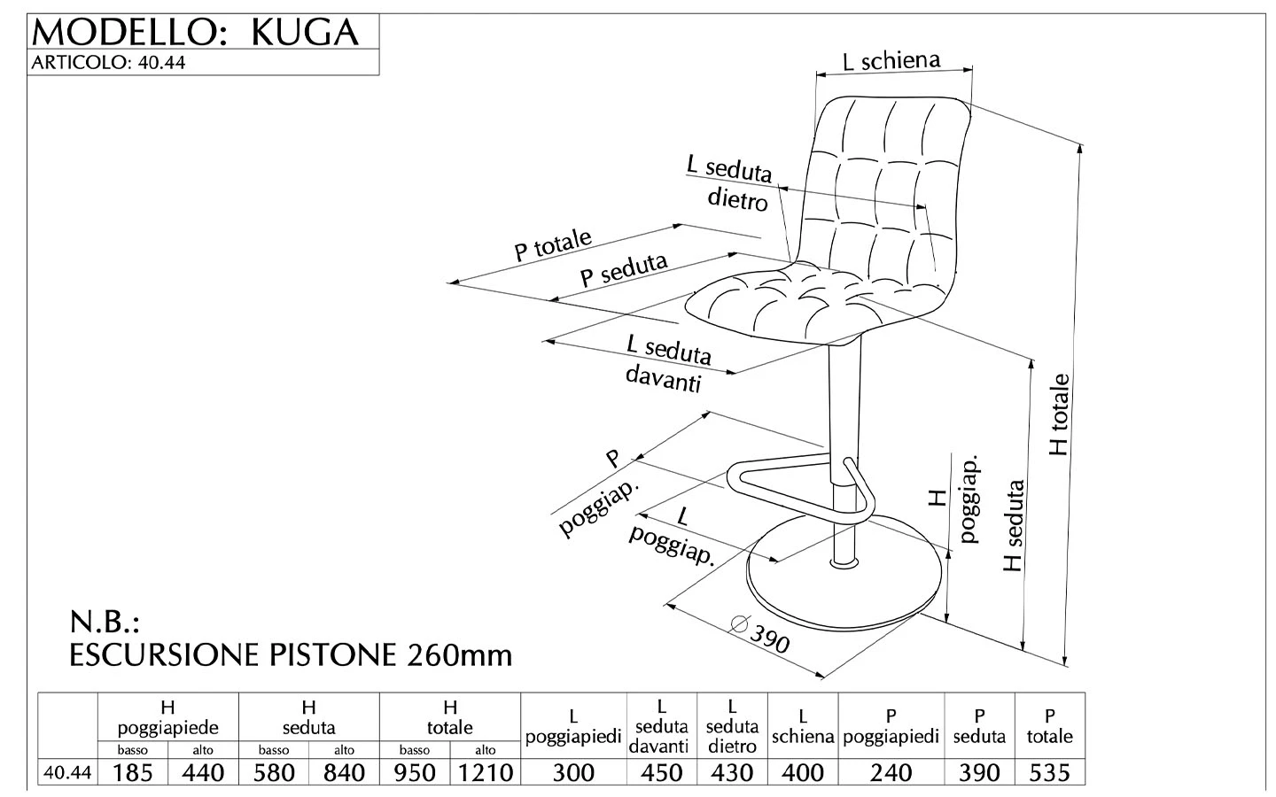KUGA SWIVEL е италиански бар стол от колекцията на италианския производител Bontempi. KUGA SWIVEL може да бъде тапициран в дамаска, еко набук или естествена кожа – материал и цвят по избор на клиента. Структурата е изработена от метал във финиш хром. Основата и горната част на структурата са изработени от метал – финиш по избор на клиента. Бар столът е с въртяща се основа и регулираща се във височина. Цената на стола се формира на база на избора на вид тапицерия и финиш на основата.