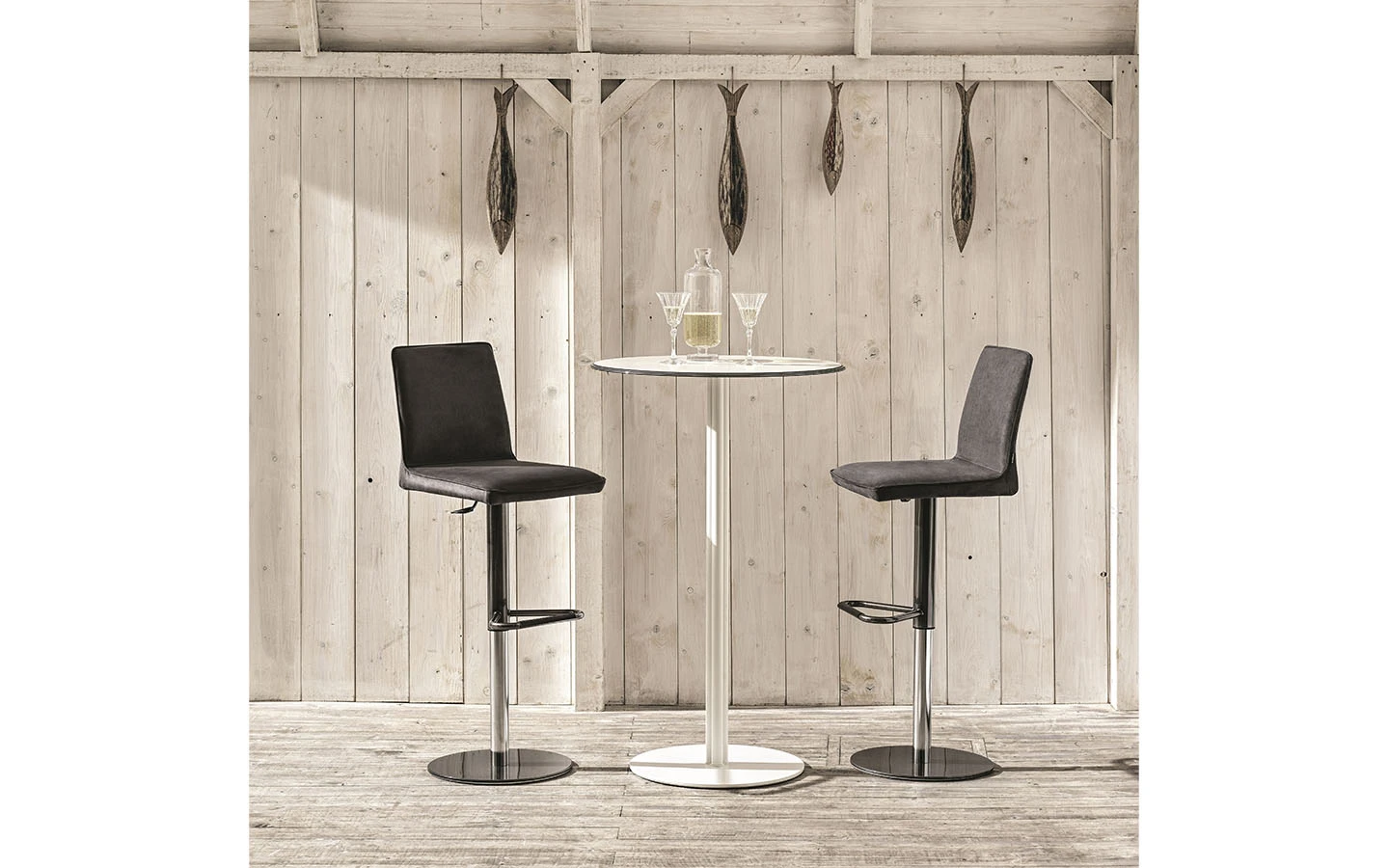 Въртящият се бар стол NATA SWIVEL от Bontempi Casa съчетава модерен дизайн с изключителен комфорт. Той разполага със стилна метална структура, оборудвана с газов лифт механизъм, който позволява плавно регулиране на височината и въртене на 360 градуса. Тази комбинация от елегантен дизайн и практични функции прави въртящия се бар стол NATA универсален избор както за домашни, така и за търговски пространства.