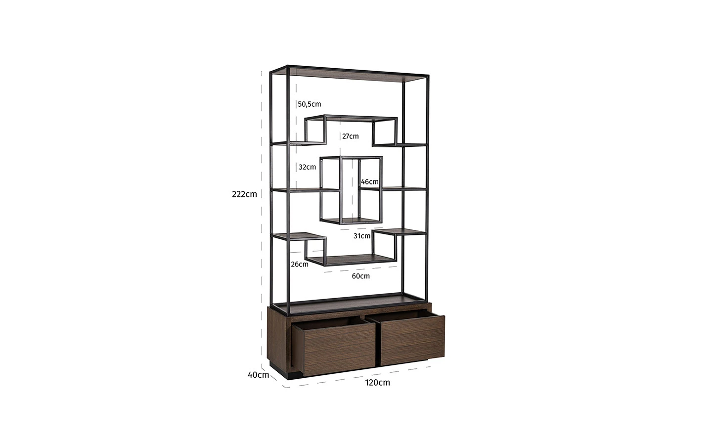 Библиотеката BONVOY BROWN 2-DRAWERS от Richmond Interiors е елегантна и функционална мебел, която съчетава съвременен дизайн с практичност. Изработена от висококачествен дъбов фурнир в топъл кафяв цвят, тя придава уют и стил на всяко пространство. С размери 222 см височина, 120 см ширина и 40 см дълбочина, тази библиотека предлага отворени рафтове в горната част, идеални за излагане на книги, декоративни предмети или лични колекции. Долната част разполага с две просторни чекмеджета, които осигуряват допълнително място за съхранение, като същевременно поддържат изчистената визия на помещението. Тази библиотека е перфектен избор за тези, които търсят съчетание от стил, функционалност и качество в интериора си.
