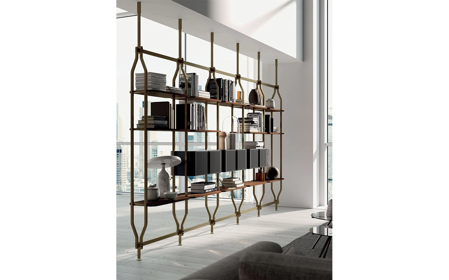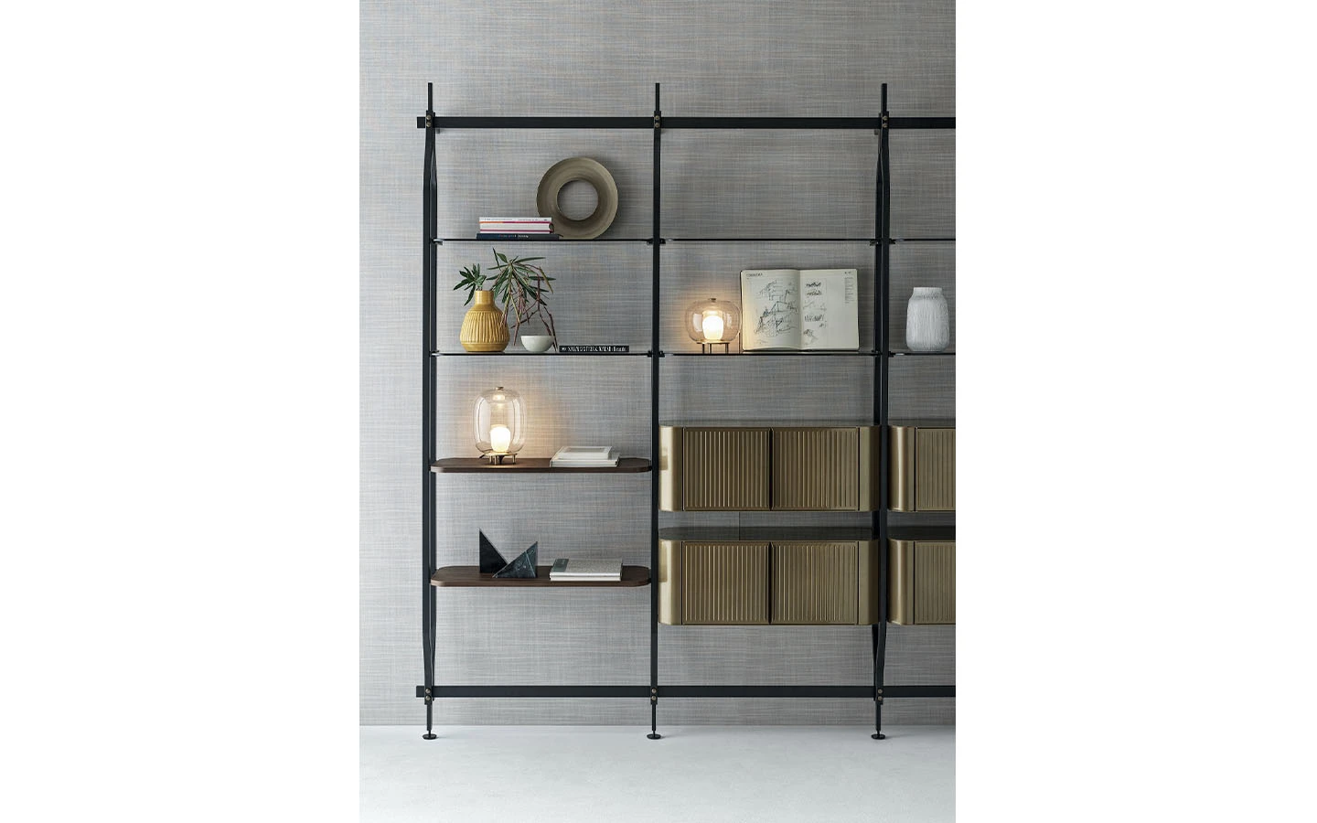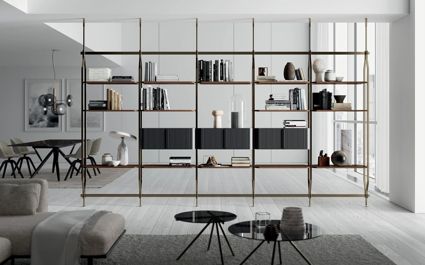 Библиотеката CHARLOTTE от Bontempi Casa е модерно и гъвкаво решение за съхранение, проектирано от Shannon Sadler. Нейният модулен дизайн позволява както монтаж на стена, така и закрепване между пода и тавана, което я прави изключително адаптивна към различни интериорни пространства. CHARLOTTE може да бъде конфигурирана с 4, 8, 12, 16 или 20 рафта, като се предлагат и допълнителни модули за съхранение, което осигурява гъвкавост в зависимост от нуждите. Библиотеката може да се използва както като класическа библиотека, така и като елегантен разделител на пространството. Тази библиотека предлага идеален баланс между функционалност и естетика, като позволява интелигентно използване на пространството. Съчетавайки модулност, богато разнообразие от покрития и гъвкави възможности за монтаж, CHARLOTTE е стилно и практично допълнение към модерния интериор.