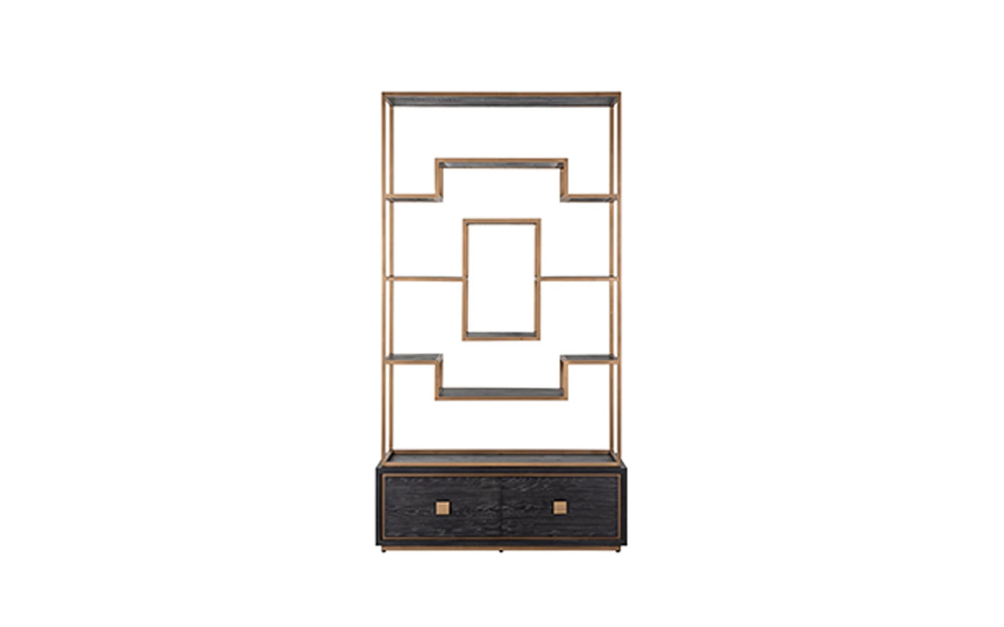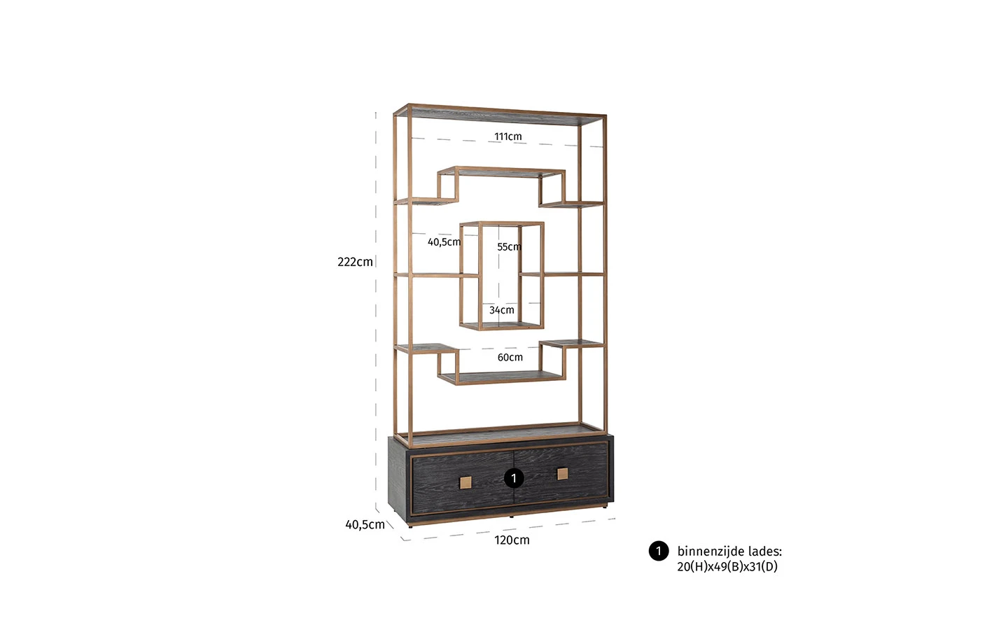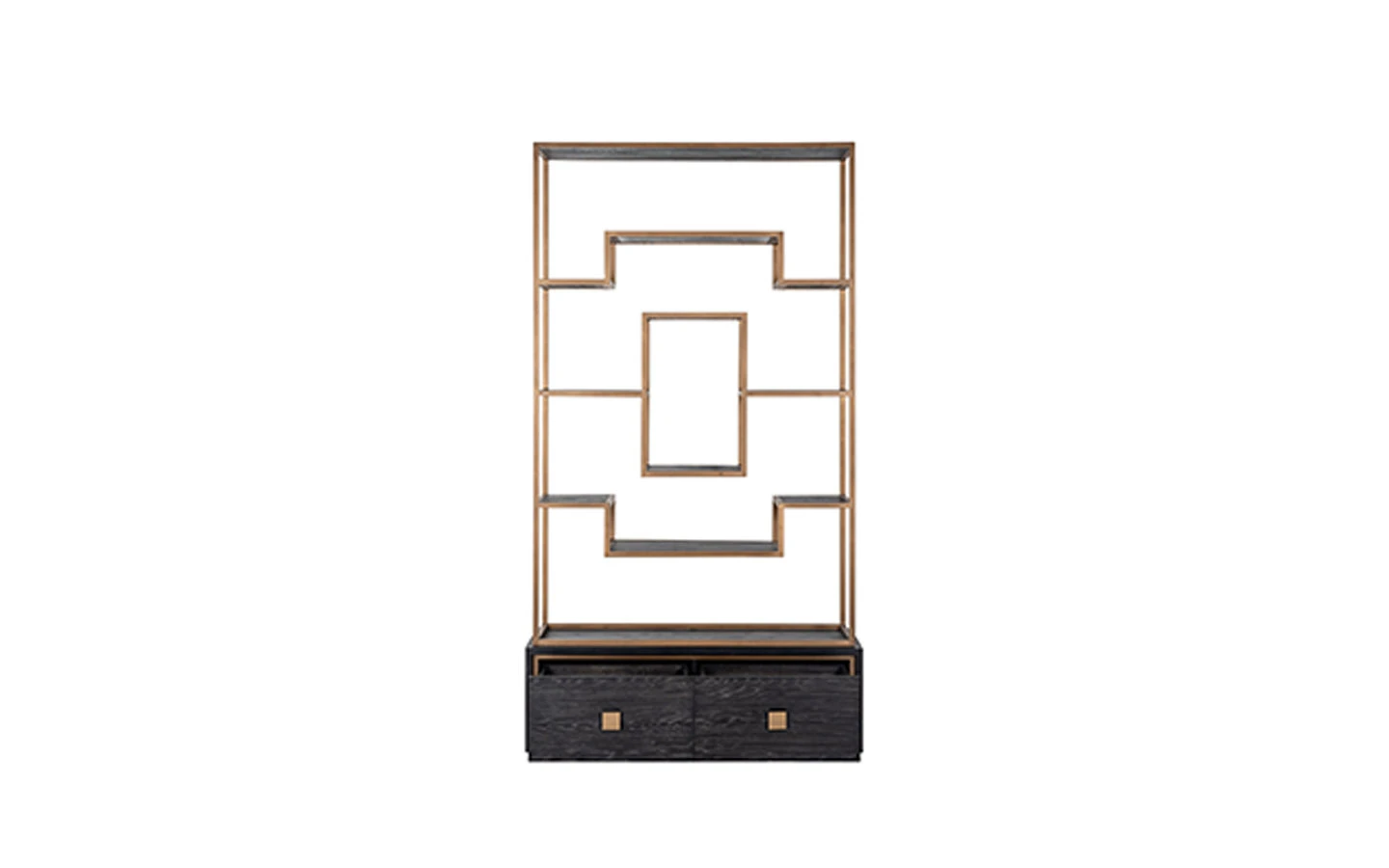 Библиотеката HUNTER 2 DRAWERS от Richmond Interiors е впечатляващо съчетание на индустриален стил и елегантен дизайн, което я прави изключително подходяща за модерни интериори. Изработена от черен дъбов фурнир и допълнена с месингова структура, тя придава усещане за лукс и изтънченост на всяко пространство. С размери 222 см височина, 120 см ширина и 40.5 см дълбочина, тази библиотека предлага отворени рафтове в горната част, идеални за излагане на книги, декоративни предмети или лични колекции. Долната част разполага с две чекмеджета, зад които се крие допълнително пространство за съхранение, осигурявайки практичност и естетика в едно. Тази библиотека е идеален избор за тези, които търсят съчетание от стил, функционалност и качество в интериора си.