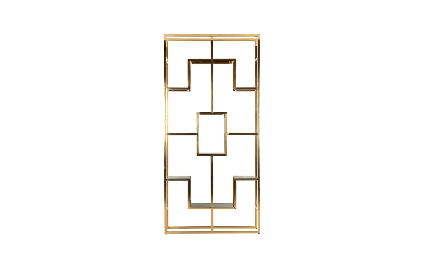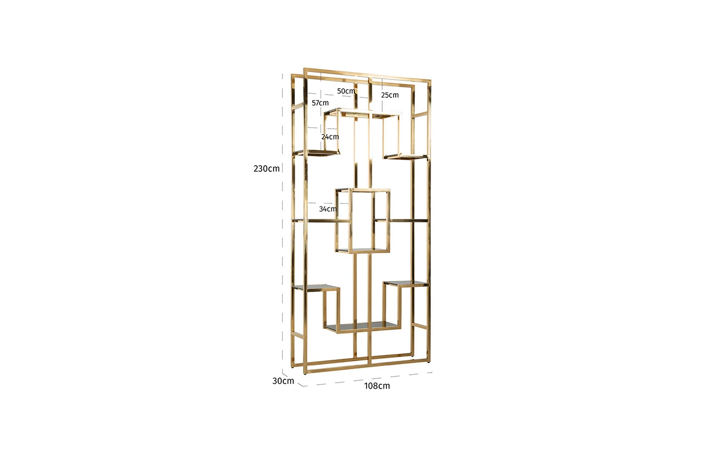 Библиотеката MAGNUS от Richmond Interiors е модерно и впечатляващо интериорно решение, което съчетава изчистен дизайн с луксозно излъчване. Изработена от златиста стомана и закалено стъкло, тя създава усещане за лекота и простор, като в същото време действа като стилен акцент в помещението. Със своите внушителни размери – 230 см височина, 108 см ширина и 30 см дълбочина – тази библиотека предлага щедро пространство за подредба на книги, списания, декоративни предмети и лични колекции. Конструкцията ѝ е съставена от отворени рафтове, разположени в симетрична геометрия, която съчетава функционалност с декоративна стойност. Благодарение на елегантната си форма и лъскавия златист финиш, библиотеката MAGNUS е идеален избор за съвременни и луксозни интериори – дневна, кабинет или модерен офис. Тя съчетава стабилност, стил и практичност в един завършен и отличителен дизайн.