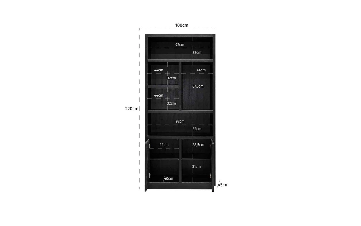 Библиотеката OAKURA BLACK 2 DOORS от Richmond Interiors е изискано и функционално допълнение към всеки модерен интериор, съчетаващо минималистичен дизайн с високо качество на изработка. Изработена от черен дъбов фурнир, тя придава елегантност и стил на всяко пространство. С размери 220 см височина, 100 см ширина и 45 см дълбочина, тази библиотека предлага щедро пространство за съхранение и излагане на книги, декоративни предмети или лични колекции. Горната част разполага с отворени рафтове, подходящи за подреждане на любими предмети, докато долната част е оборудвана с две врати, зад които се крие допълнително място за съхранение. Тази библиотека е идеален избор за тези, които търсят съчетание от стил, функционалност и качество в интериора си.