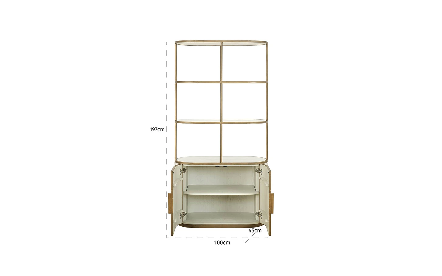 Библиотеката TIVOLI 2 DOORS 3 OPEN SHELVES от Richmond Interiors е изискано и функционално допълнение към всеки модерен интериор. Изработена от метал и керамика, тя впечатлява със своя елегантен бял цвят и съвременна форма, която се вписва с лекота както в класически, така и в минималистични пространства. С височина 197 см, ширина 100 см и дълбочина 45 см, библиотеката предлага три отворени рафта в горната част – идеални за подредба на книги, декорации или лични предмети. В долната част се намират две врати, зад които има скрито пространство за практично съхранение. TIVOLI 2 DOORS 3 OPEN SHELVES е отличен избор за интериор, в който стилът, светлината и подредеността вървят ръка за ръка. Тя е не само мебел за съхранение, но и изтънчен визуален акцент в дома.