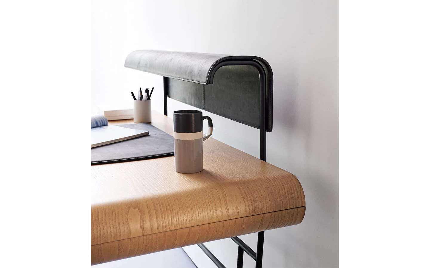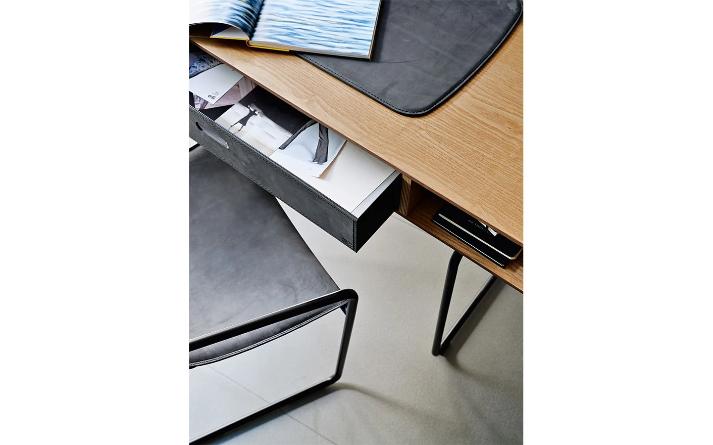 APELLE е италианско бюро от колекцията на италианския производител MIDJ. Бюрото е с вградено осветление. Структурата е изработена от метал – финиш по избор. Плотът е изработен от извито фурнировано дърво – вид и финиш по избор. Чекмедже и декоративен детайл, изработени от естествен гьон – по избор на клиента. Опционално, към бюрото може да се добави подложка от естествен гьон. Цената на бюрото се определя от финиша на фурнированото дърво, вида естествен гьон и финиша на металната структура.