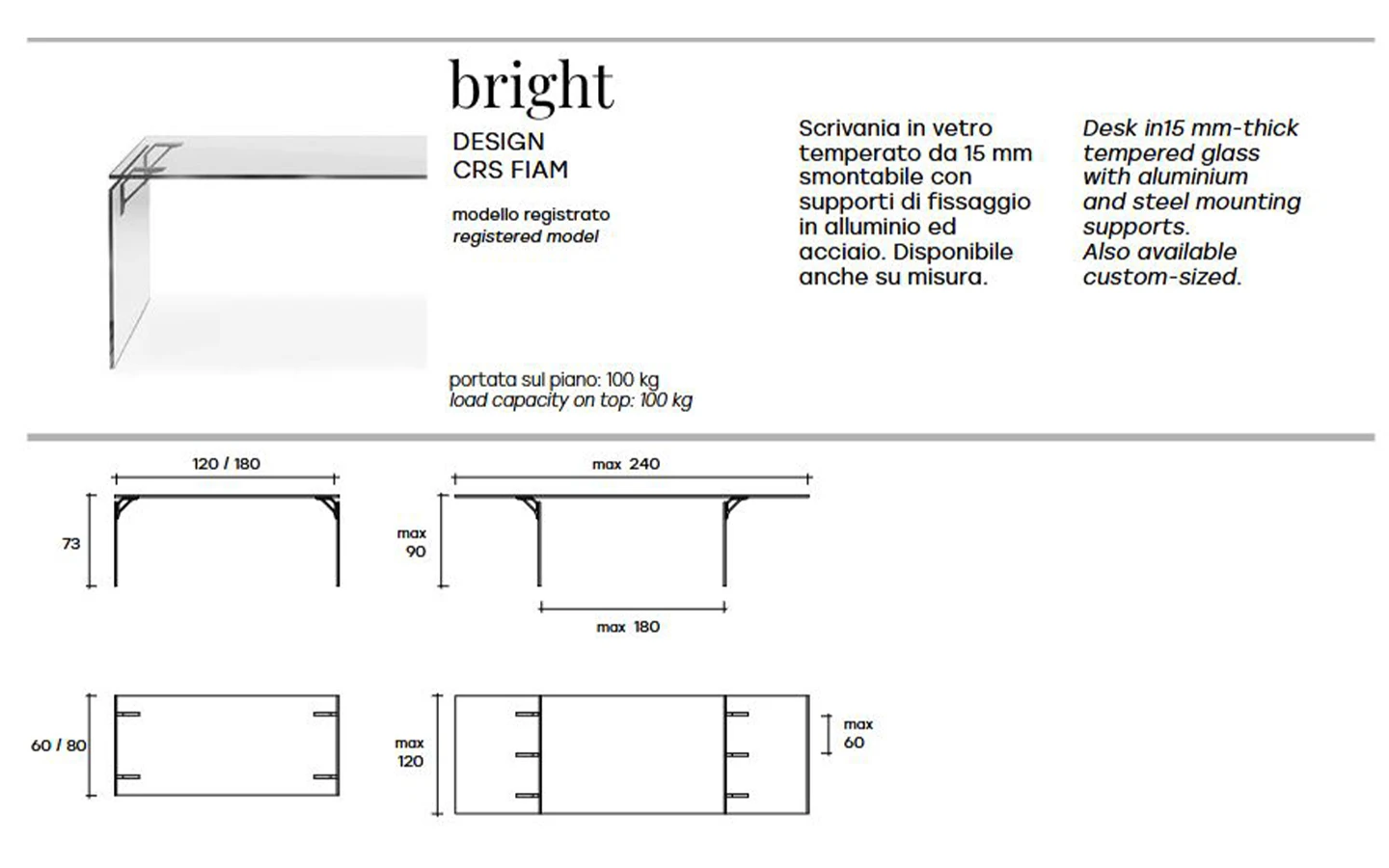 BRIGHT е италианско бюро от колекцията на италианския производител FIAM Italia. Бюрото е изработено от закалено стъкло. Конзоли (закрепящи елементи), изработени от алуминий и стомана. Цената на бюрото се формира на база избора на размер.