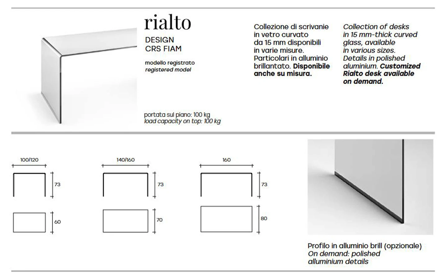 RIALTO е италианско бюро от колекцията на италианския производител FIAM Italia. Бюрото е изработено от извито прозрачно стъкло. Детайли, изработени от алуминий. Цената на бюрото се формира на база избора на размер.