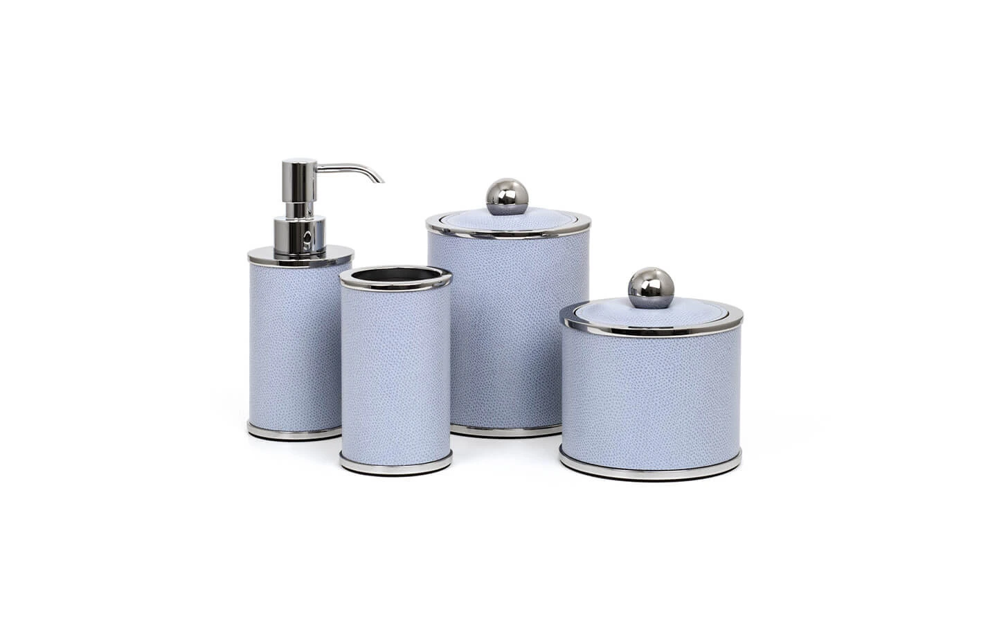 OLIMPIA ROUND CHROME е чаша за четки за зъби от колекцията на италианския производител PINETTI. Чашата е с цилиндрична форма и е изработенa от естествена кожа – цвят по избор. Структурата е изработена от метал – финиш Chrome. Цената се определя спрямо избора на цвят кожа.