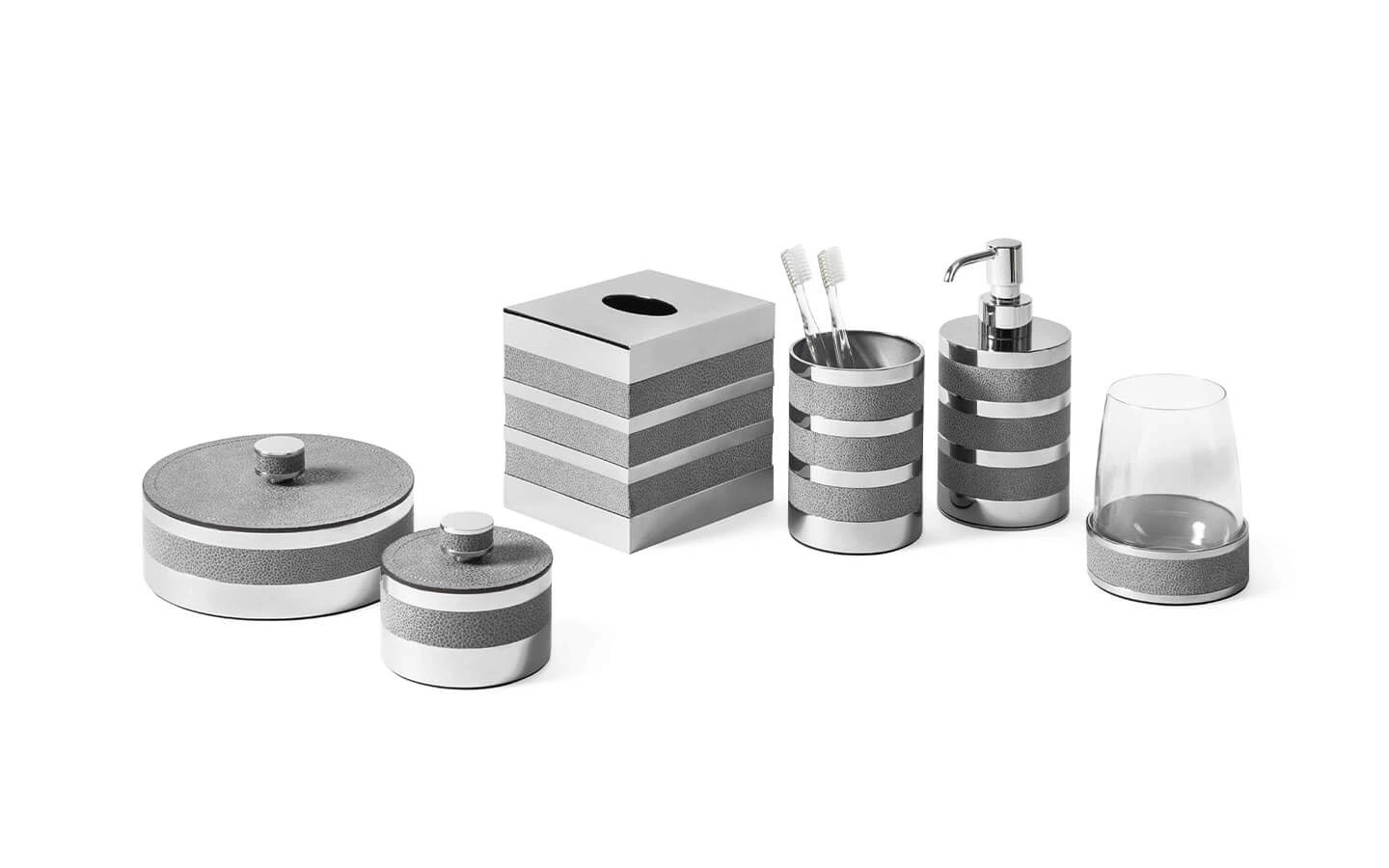 SATURNO CHROME е чаша за четки за зъби от колекцията на италианския производител PINETTI. Чашата е с цилиндрична форма и е изработенa от естествена кожа – цвят по избор. Структурата е изработена от метaл – финиш Chrome. Цената се определя спрямо избора на цвят кожа.