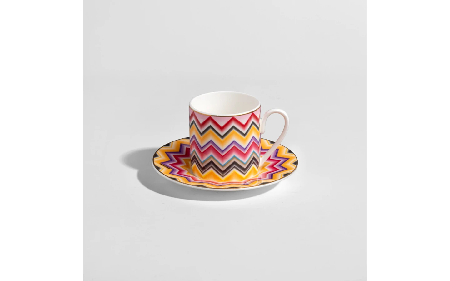 Чаша за кафе с чинийка от колекцията Marrakech на Missoni Home. Тази зашеметяваща колекция от фин костен порцелан е характерна и цветна – всичко, което бихте очаквали от серия на Missoni Home. Колекцията Marrakech се отличава с характерните за марката зигзагообразни шарки и богати цветови палитри.