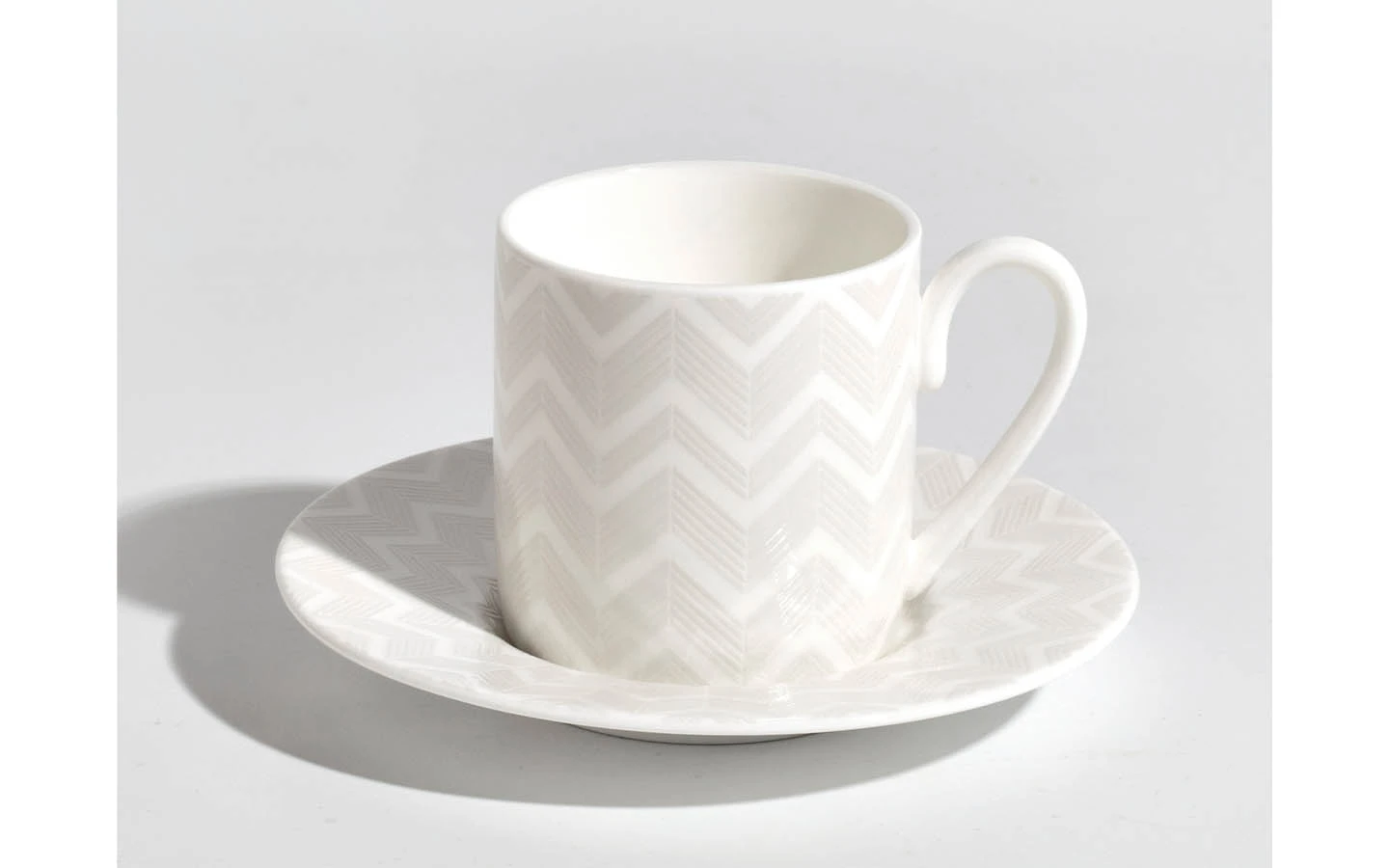 Чаша за кафе с чинийка от колекцията Zig Zag White на Missoni Home. Тази колекция е изработена от фин костен порцелан и се отличава с изчистен и елегантен дизайн.