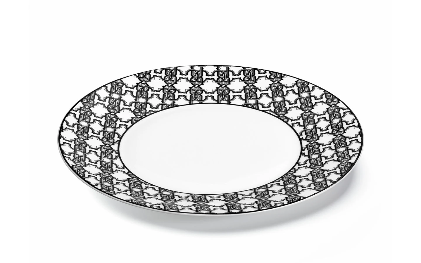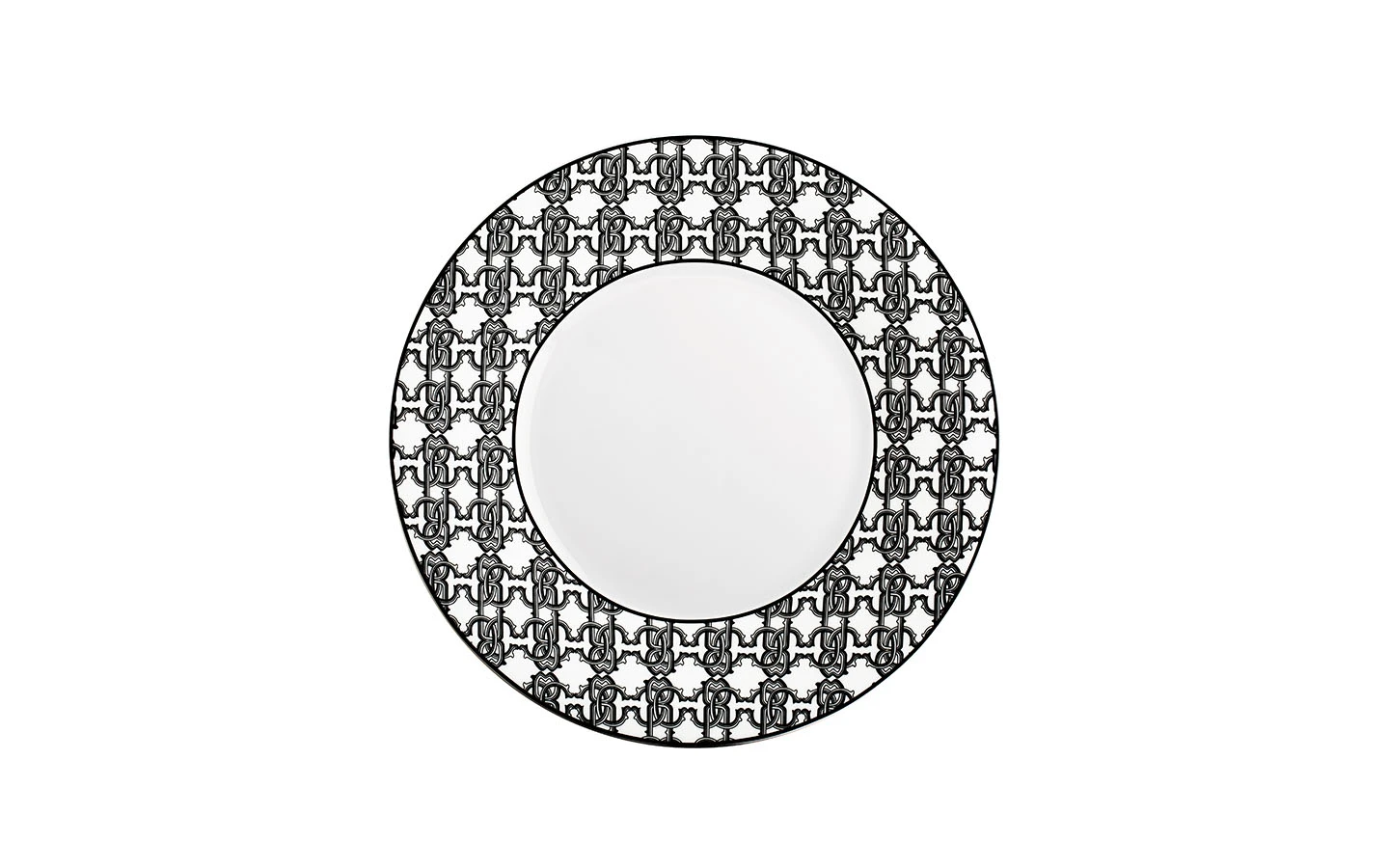 Чиния от колекцията Monogram Black от Roberto Cavalli Home. Зашеметяващият монограм на Roberto Cavalli украсява красивия бял костен порцелан в целия му блясък.