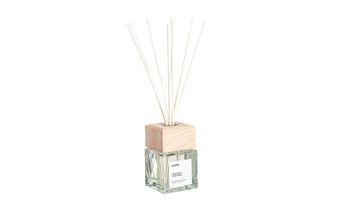 Дифузер BIZZOTTO WHITE TEA AND ORCHID е аромат за интериори с шест бели ароматни пръчици с височина 30 см и принадлежи към цветното ароматно семейство. Предлага се в стъклена бутилка с вместимост 200 ml, снабдена с пластмасова капачка и декоративен капак от естествено дърво. Формулата комбинира изискано и обгръщащо ухание на сочни плодове, флорален акорд на орхидея и деликатни нотки на мъх и ванилия. Подходящ е за помещения с площ до 40 m² и е особено препоръчителен за спални и дневни зони, в които се търси усещане за релакс и комфорт. Продуктът съдържа силно запалими течности и пари и трябва да се използва с повишено внимание.
