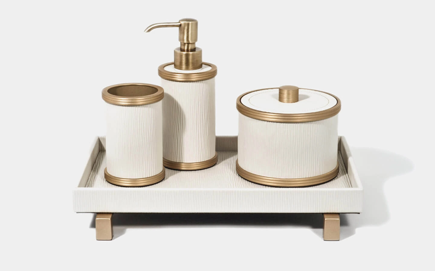 CAROL GOLD е диспенсър за сапун от колекцията на италианския производител PINETTI. Изработен е от комбинация между естествена кожа – вид и цвят по избор и месинг – финиш satin brass. Цената се определя спрямо избора на вид кожа. Размерите му са см. ⌀ 6,5/15Н.