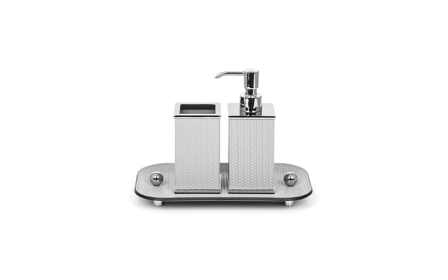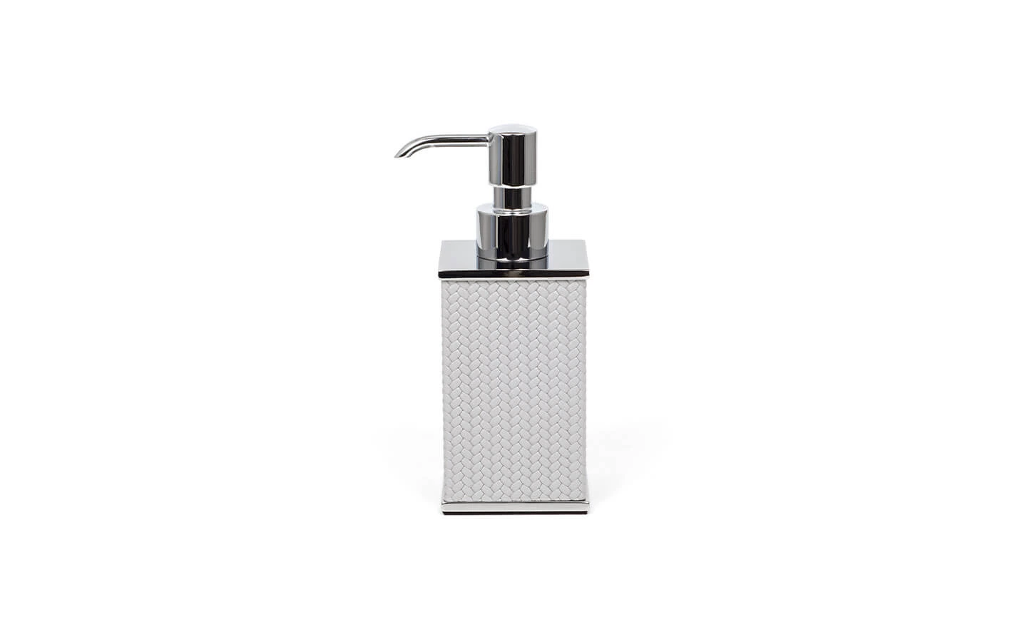 Диспенсърът OLIMPIA SQUARE CHROME на PINETTI е с модерна квадратна форма и е обвит във водоустойчива естествена кожа, която подчертава минималистичния и елегантен характер на модела. Горната част с помпа може да бъде изпълнена в хром, златно или черем месинг, като металният акцент добавя усещане за лукс и фина детайлност. Предназначен за течен сапун или лосион, този дозатор се откроява с висококачествена изработка, внимателен подбор на материали и характерния естетически почерк на PINETTI, който съчетава практичност и изискан дизайн.
