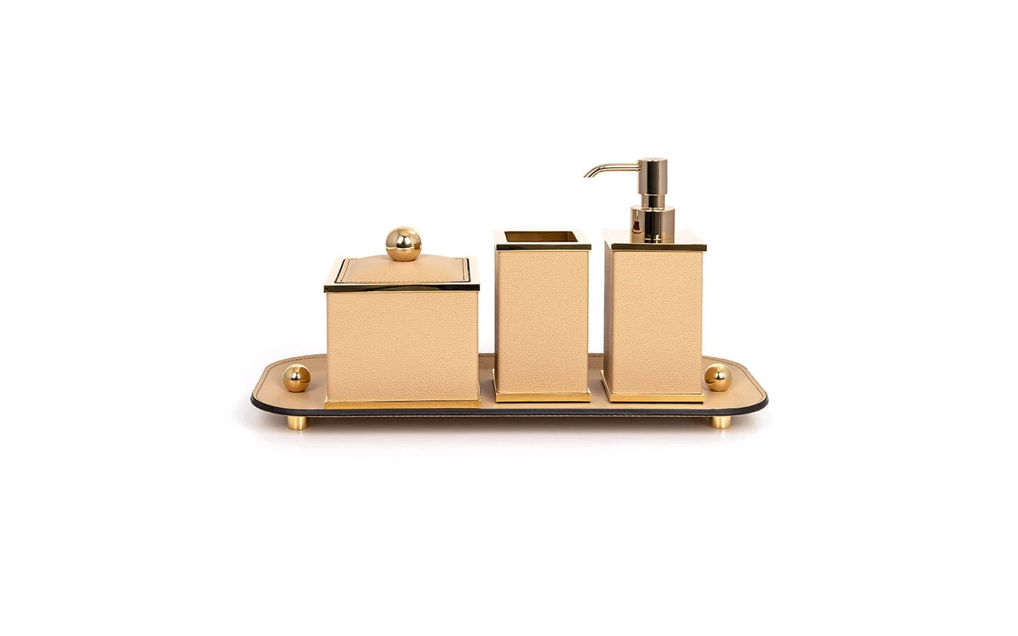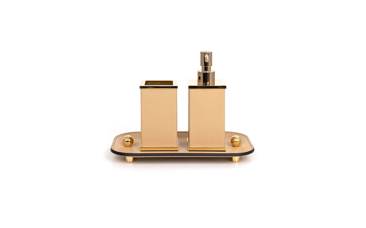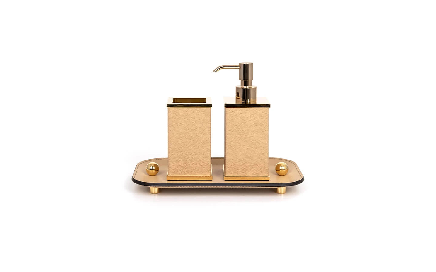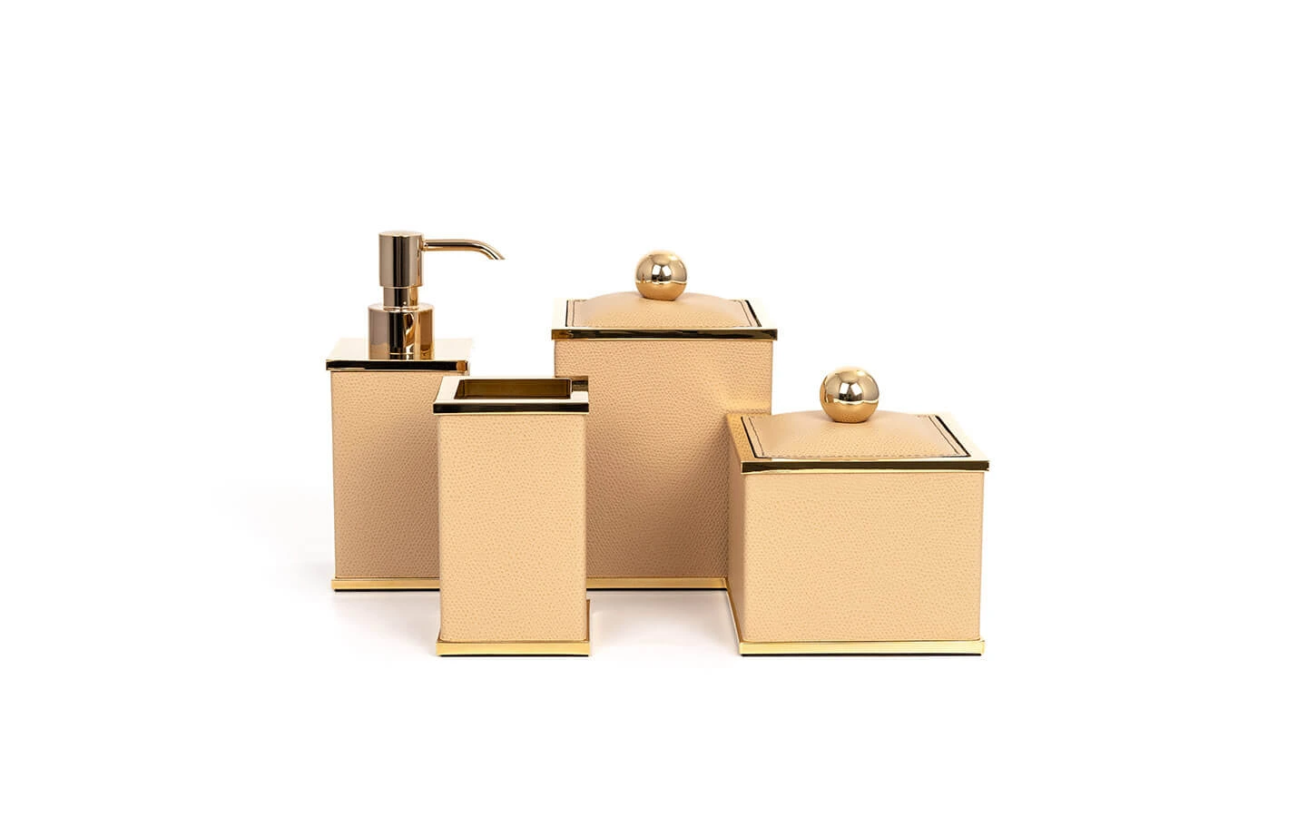 Диспенсърът OLIMPIA SQUARE GOLD на PINETTI е с модерна квадратна форма и е обвит във водоустойчива естествена кожа, която подчертава минималистичния и елегантен характер на модела. Горната част с помпа може да бъде изпълнена в хром, златно или бърниширан месинг, като металният акцент добавя усещане за лукс и фина детайлност. Предназначен за течен сапун или лосион, този дозатор се откроява с висококачествена изработка, внимателен подбор на материали и характерния естетически почерк на PINETTI, който съчетава практичност и изискан дизайн.