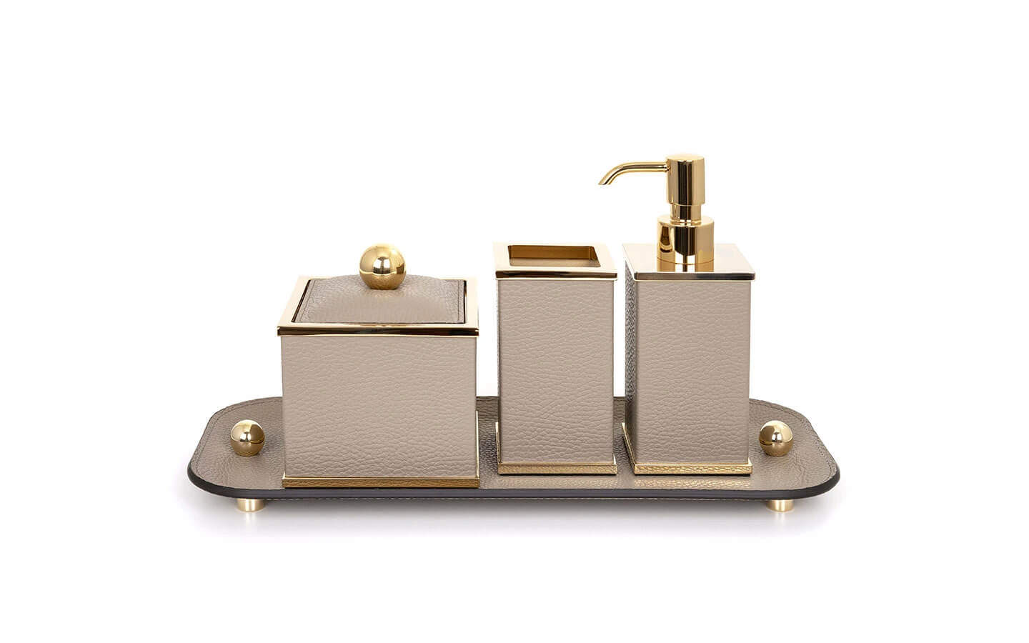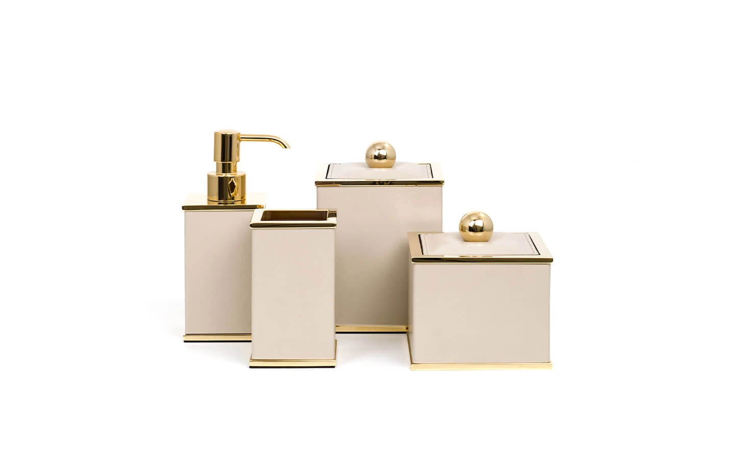 OLIMPIA SQUARE GOLD е диспенсър за сапун от колекцията на италианския производител PINETTI. Изработен е от комбинация между естествена кожа – вид и цвят по избор и месинг – финиш gold. Цената се определя спрямо избора на вид кожа. Размерите му са см. 6,5/6,5/17Н.