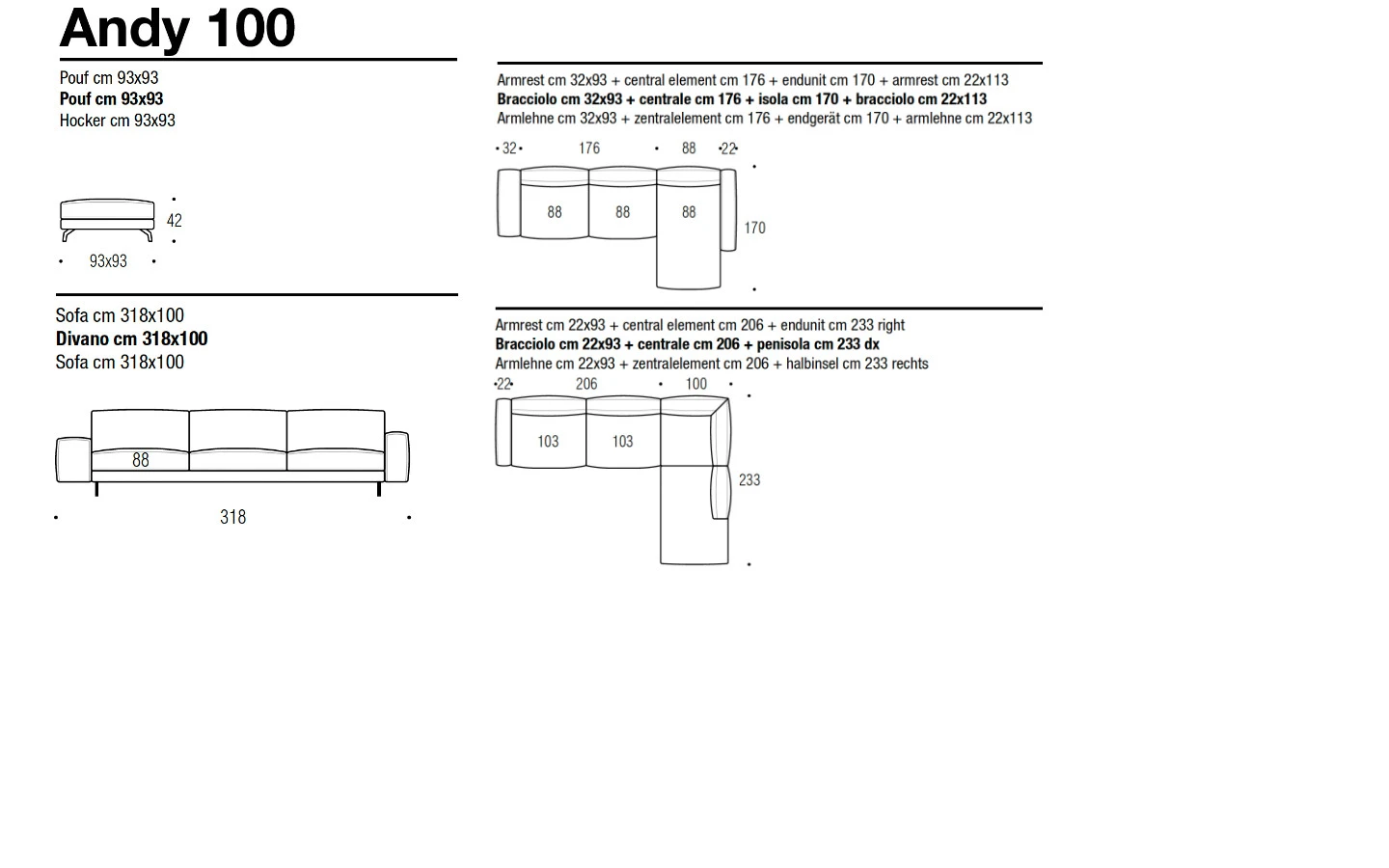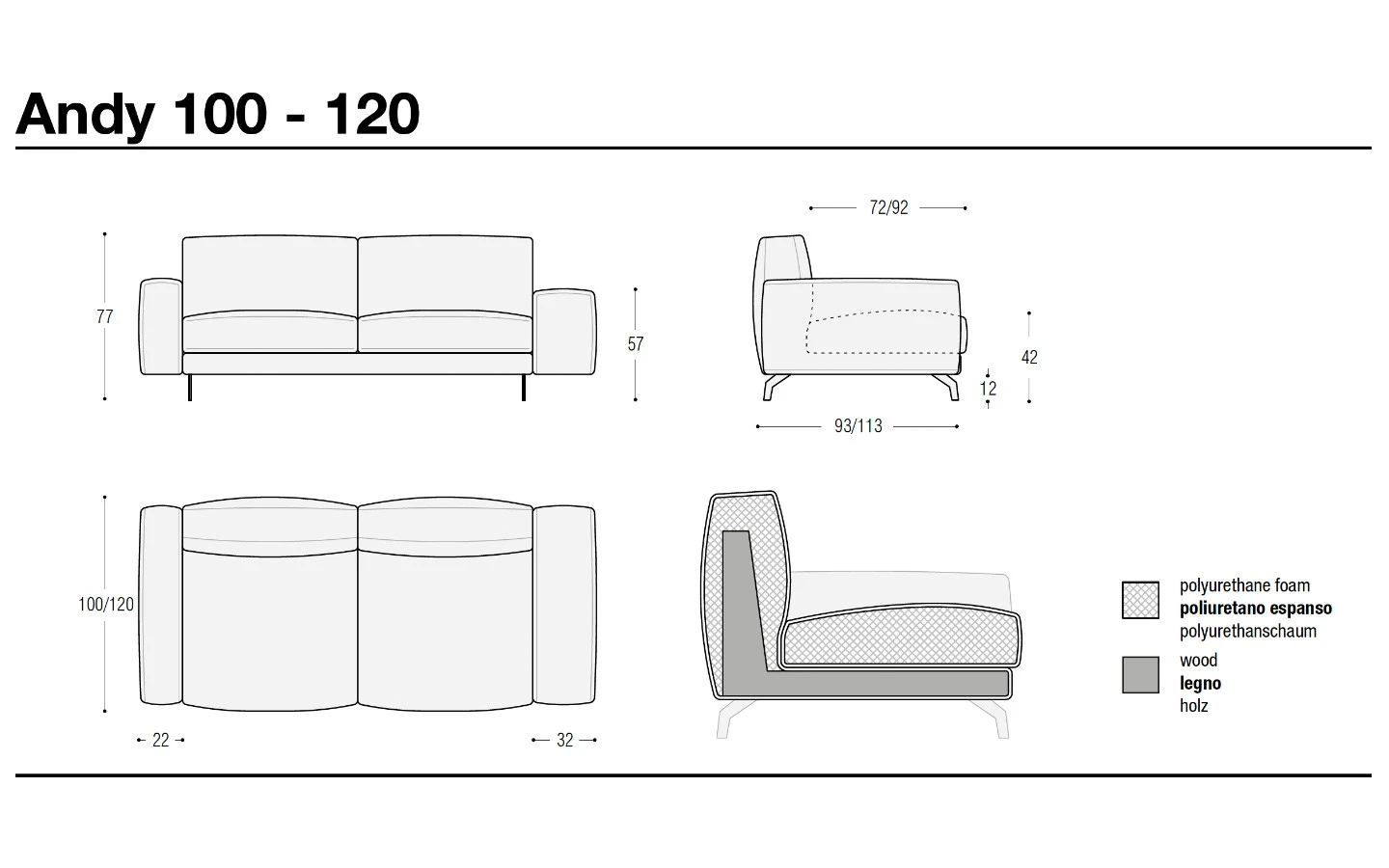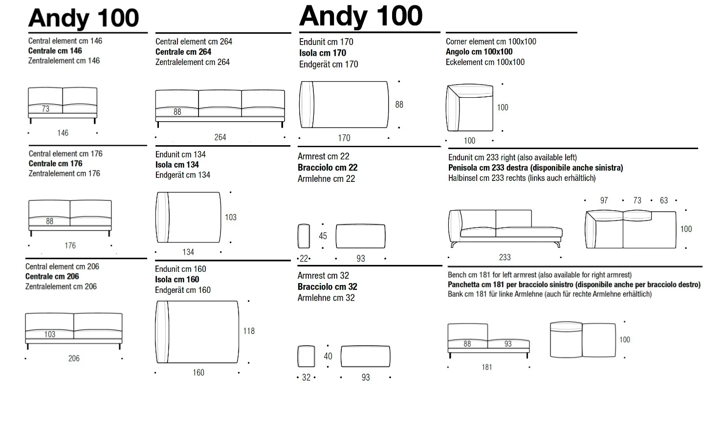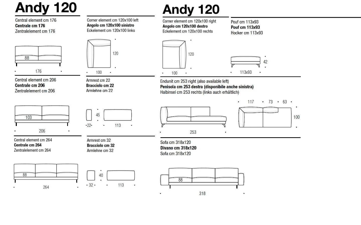 Диванът ANDY се предлага в две дълбочини – см. 100 и см. 120. Дълбочината на сядане е съответно см. 72 и см. 92. По този начин клиентът може да избере версията на дивана, която отговаря на неговите изисквания за дълбочина и комфорт.