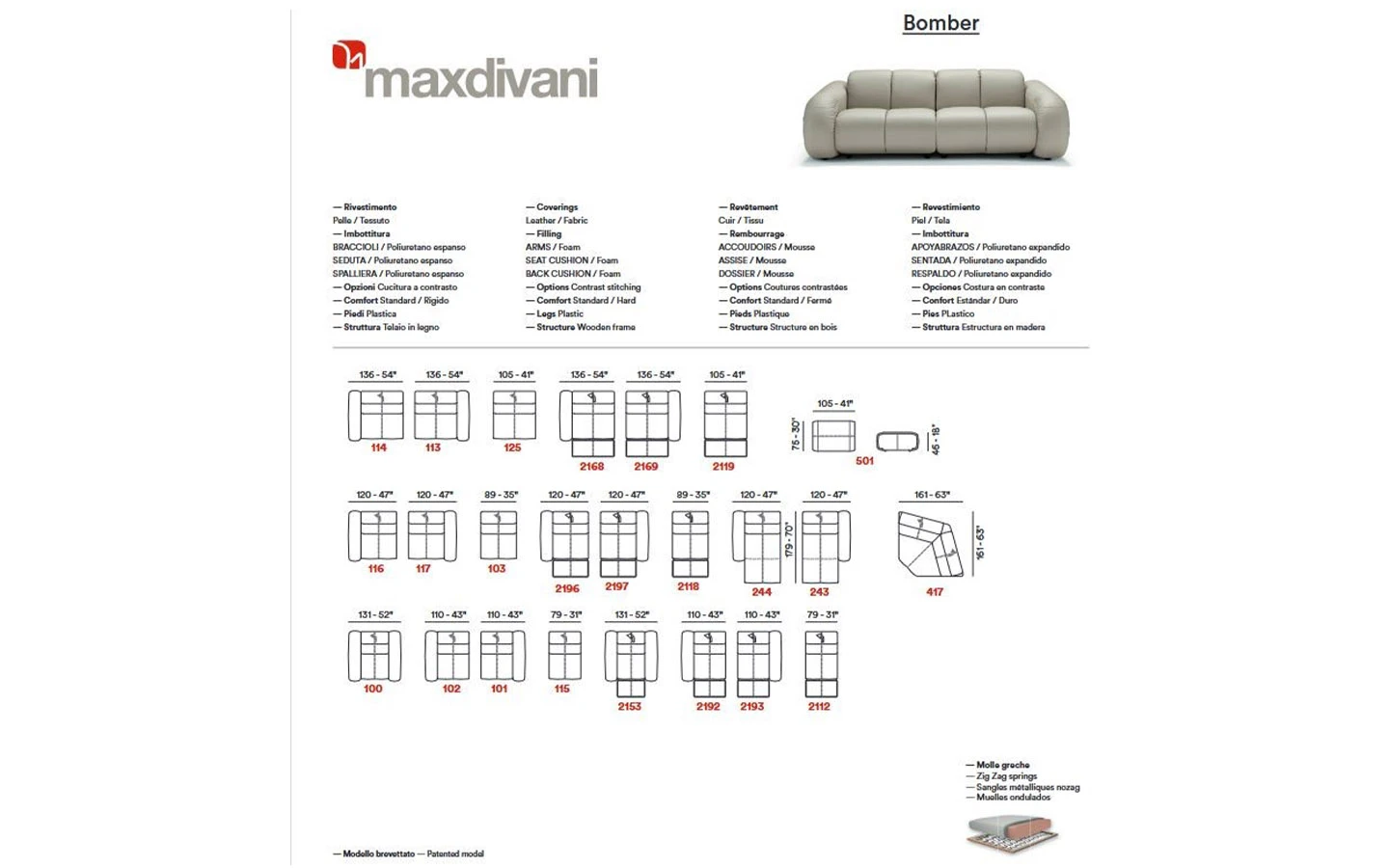BOMBER е италиански модулен диван от колекцията на италианския производител Max Divani. Италианският диван BOMBER може да бъде тапициран в дамаска, кожа или еко кожа – материал и цвят по избор на клиента. Диванът е модулен, което означава, че може да се създаде конфигурация, която да отговаря на желаните от клиента размери и форми. Седални и облегални възглавници с пълнеж от полиуретанова пяна. Облегалката е с възможност за регулиране на височината. От външната страна на подлакътника дивана е с метален профил – финиш по избор. Цената на дивана се формира на база на избора на размер и вид тапицерия. Диванът се предлага с възможност за електрически релакс механизъм.
