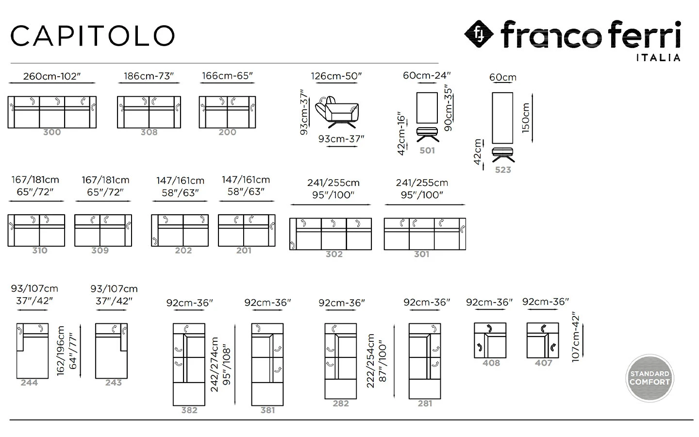 CAPITOLO е италиански модулен диван от колекцията на италианския производител Franco Ferri. Италианският диван CAPITOLO може да бъде тапициран в дамаска, кожа или еко кожа – материал и цвят по избор на клиента. Диванът е модулен, което означава, че може да се създаде конфигурация, която да отговаря на желаните от клиента размери и форми. Диванът е с метални крака – разнообразие от финиши по избор на клиента. Седални и облегални възглавници с пълнеж от полиуретанова пяна. Цената на дивана се формира на база на избора на размер и вид тапицерия.