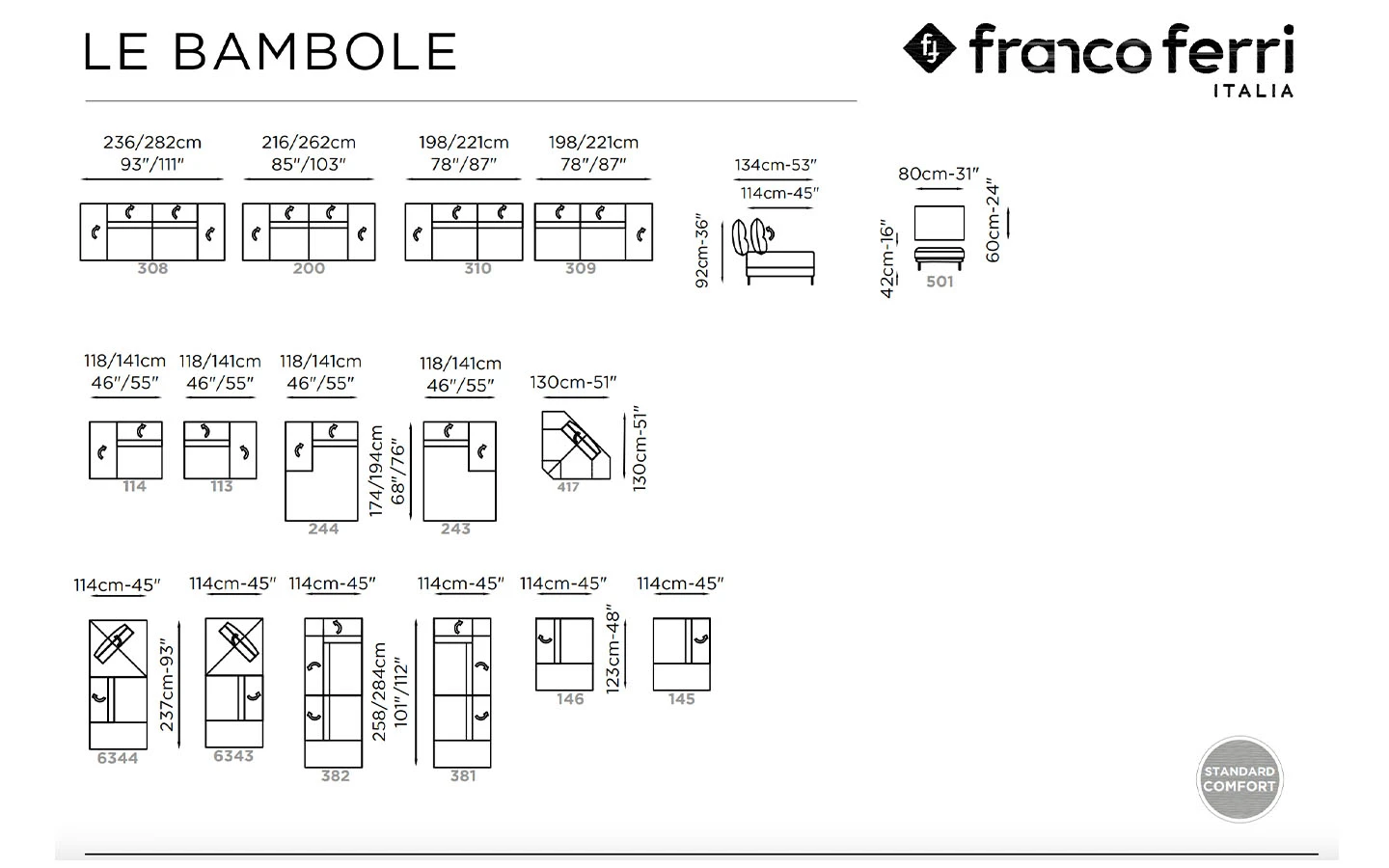 LE BAMBOLE е италиански модулен диван от колекцията на италианския производител Franco Ferri. Италианският диван LE BAMBOLE може да бъде тапициран в дамаска, кожа или еко кожа – материал и цвят по избор на клиента. Диванът е модулен, което означава, че може да се създаде конфигурация, която да отговаря на желаните от клиента размери и форми. Диванът е с метални крака – разнообразие от финиши по избор на клиента. Седални и облегални възглавници с пълнеж от полиуретанова пяна. Цената на дивана се формира на база на избора на размер и вид тапицерия.