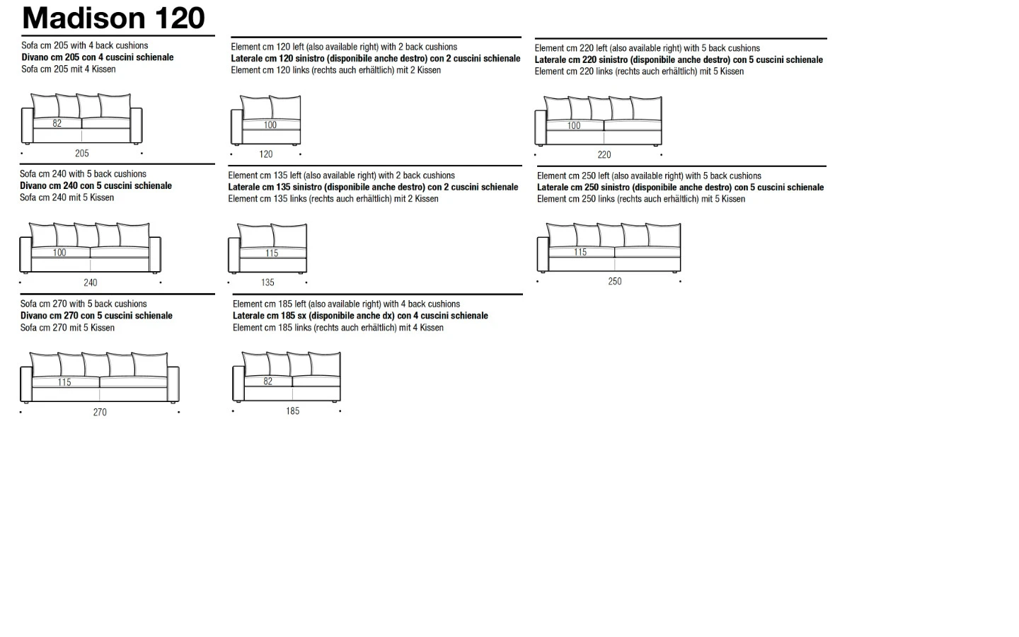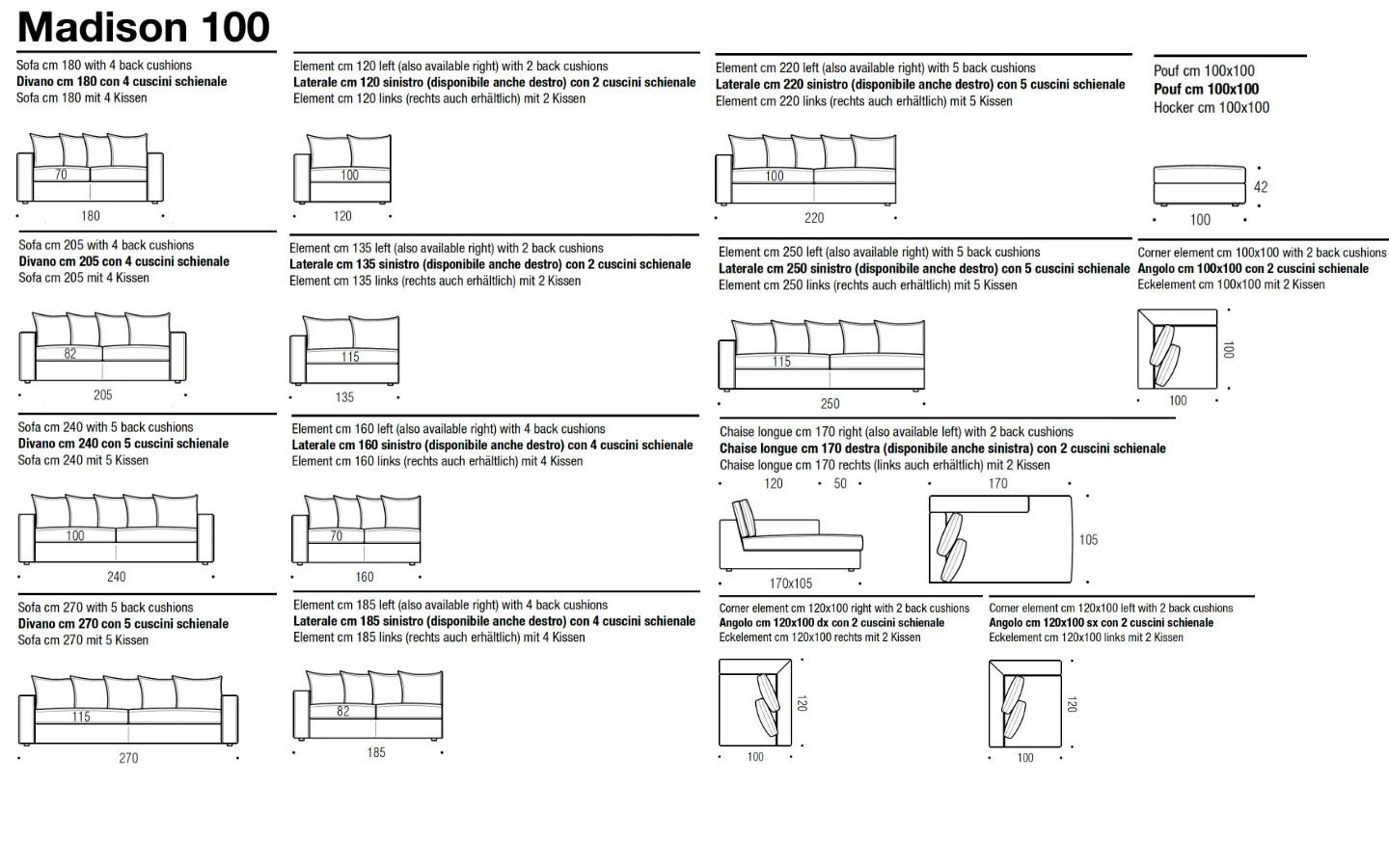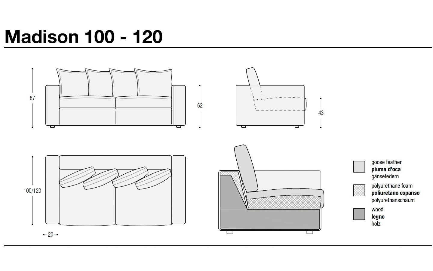 Диванът MADISON се предлага в две дълбочини – см. 100 и см. 120. По този начин клиентът може да избере версията на дивана, която отговаря на неговите изисквания за дълбочина и комфорт.