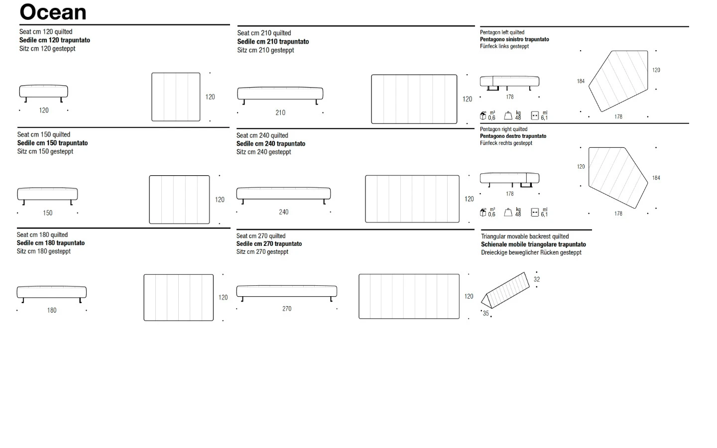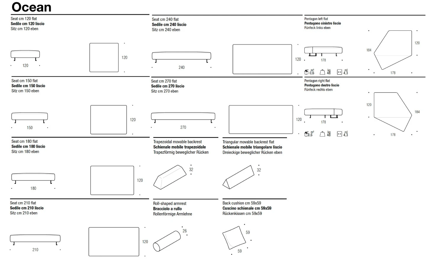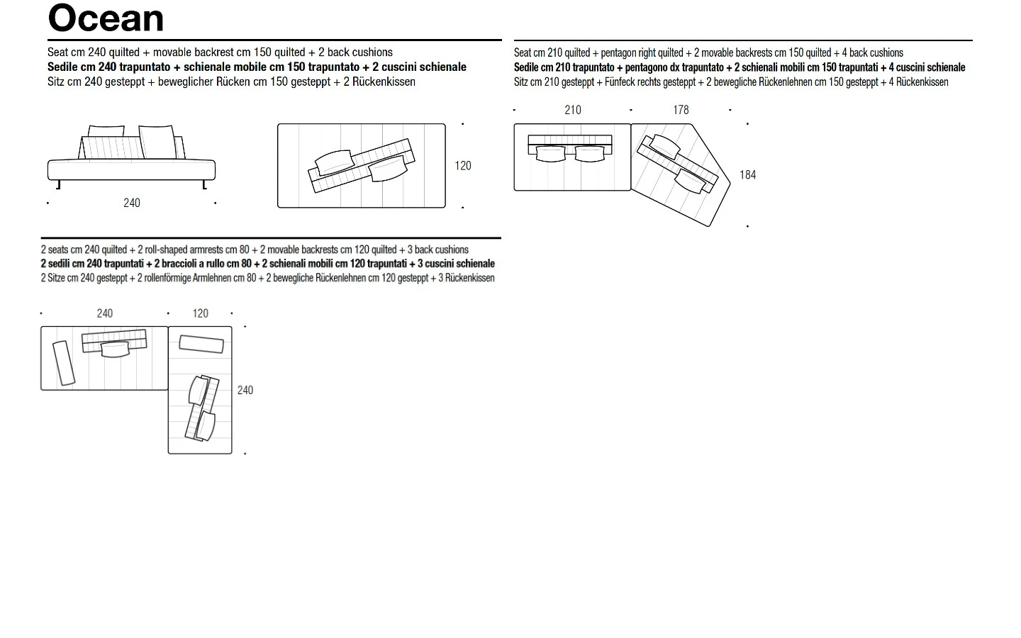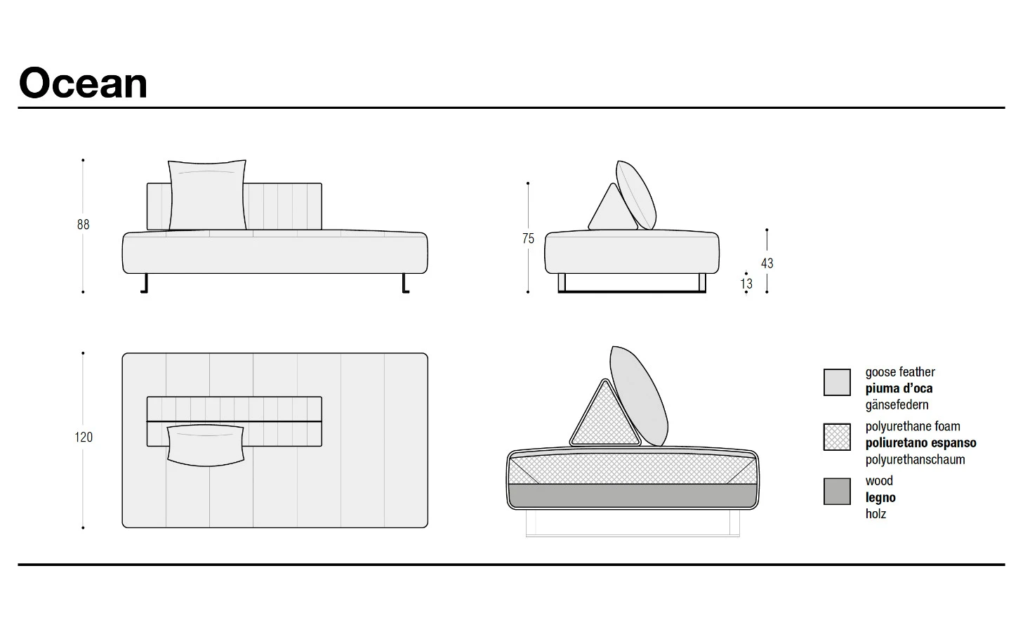 OCEAN е италиански модулен диван от колекцията на италианския производител Flexteam. Италианският диван OCEAN може да бъде тапициран в дамаска или еко кожа – материал и цвят по избор на клиента. Диванът е модулен, което означава, че може да се създаде конфигурация, която да отговаря на желаните от клиента размери и форми. Диванът е с метални П-образни крака – финиш Graphite grey. Седални възглавници с пълнеж от полиуретанова пяна с различна плътност. Подвижен гръб и възглавници под формата на руло с пълнеж от полиуретанова пяна. Облегални възглавници с пълнеж от гъши пух. Диванът се предлага с капитонаж на райе или без. Цената на дивана се формира на база на избора на размер и вид тапицерия.