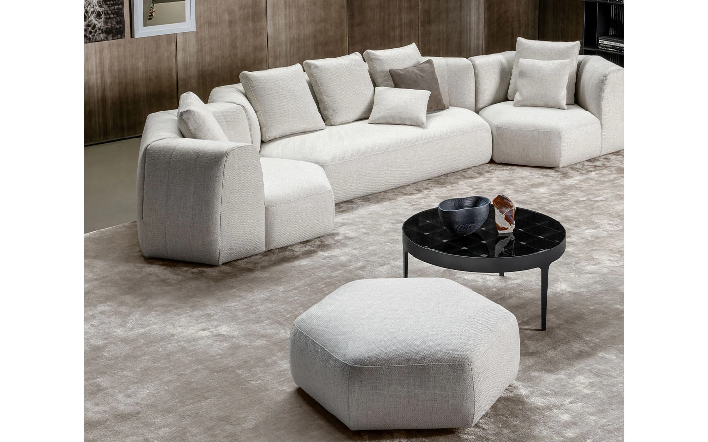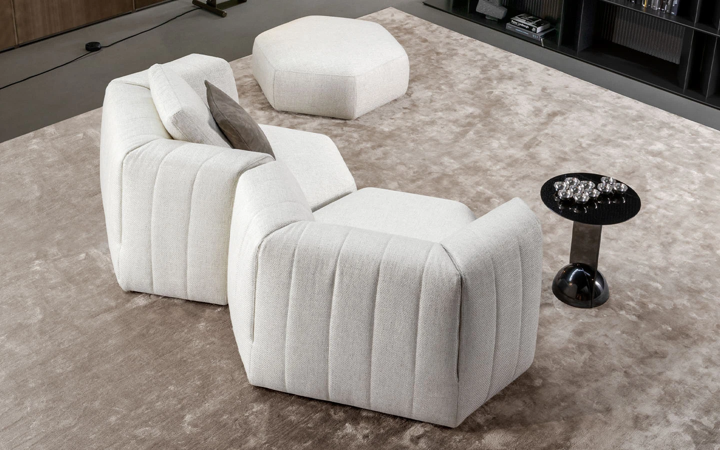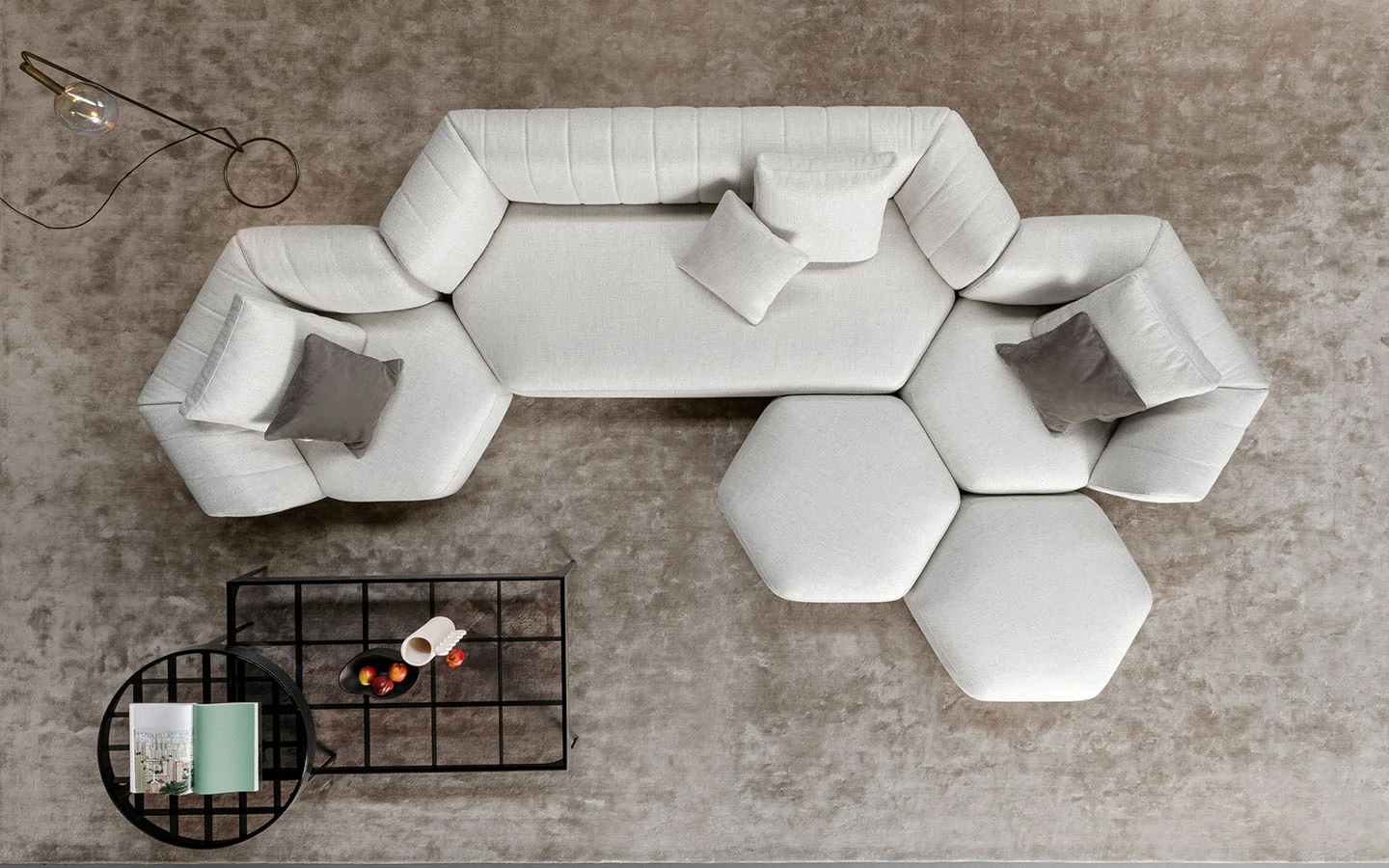 PANORAMA NEW е модулен диван, способен да създаде невиждано домашно пространство, предлагайки места за срещи, острови на комфорт и истински убежища, в които можете да се отпуснете с пълна свобода. Неговата геометрия стимулира съчетаването на различни елементи, преобразявайки дневната зона в най-топлата и приветлива среда. Колекцията дивани PANORAMA NEW се основава на особен елемент: пуф с шестоъгълна форма, който, с подлакътници и облегалка, става фотьойл и който може да се комбинира с други фотьойли и дивани, за да се получат най-разнообразни конфигурации.