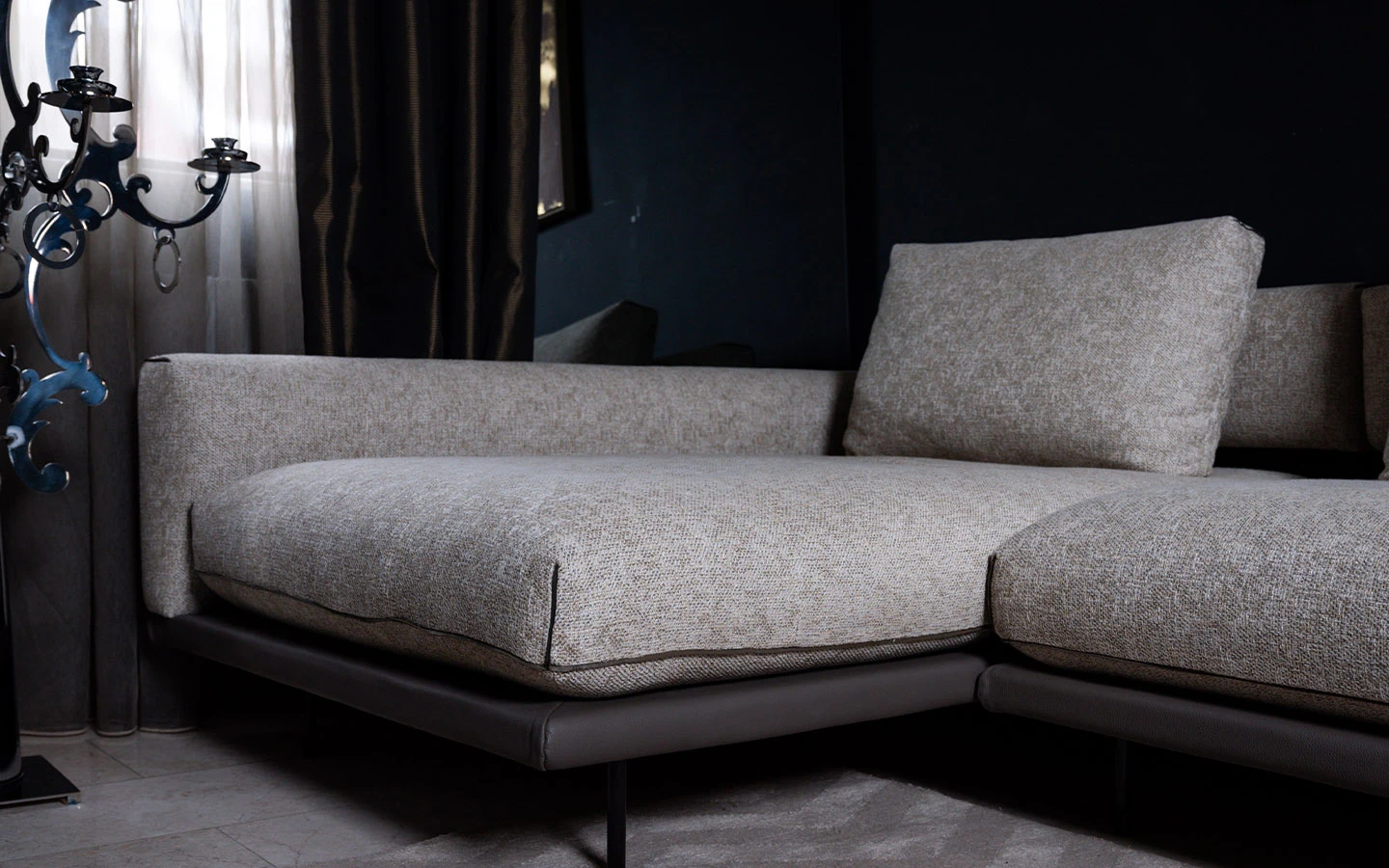PERCY е италиански диван с лежанка от колекцията на италианския производител Max Divani. Диванът е тапициран в структурна дамаска – цвят светло бежов. Основата и канта са изработени от естествена кожа в контрастен цвят. Метални крака и метални елементи на гърба на дивана във финиш Titanium 46. Диванът е с размери см. см. 327/161/85H.