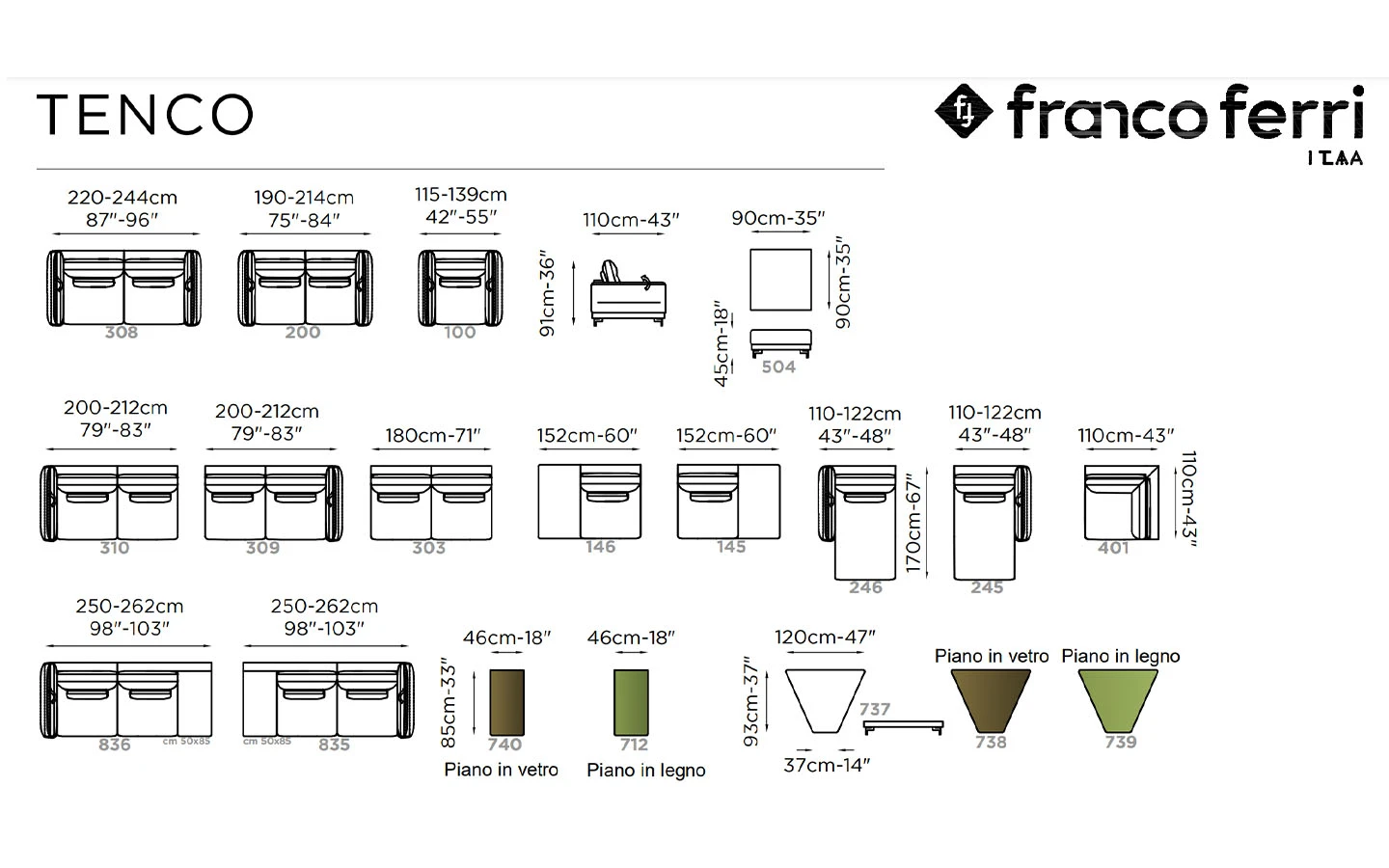 TENCO е италиански модулен диван от колекцията на италианския производител Franco Ferri. Италианският диван TENCO може да бъде тапициран в дамаска, кожа или еко кожа – материал и цвят по избор на клиента. Диванът е модулен, което означава, че може да се създаде конфигурация, която да отговаря на желаните от клиента размери и форми. Диванът е с метални крака – разнообразие от финиши по избор на клиента. Седални и облегални възглавници с пълнеж от полиуретанова пяна и гъши пух. Цената на дивана се формира на база на избора на размер и вид тапицерия.