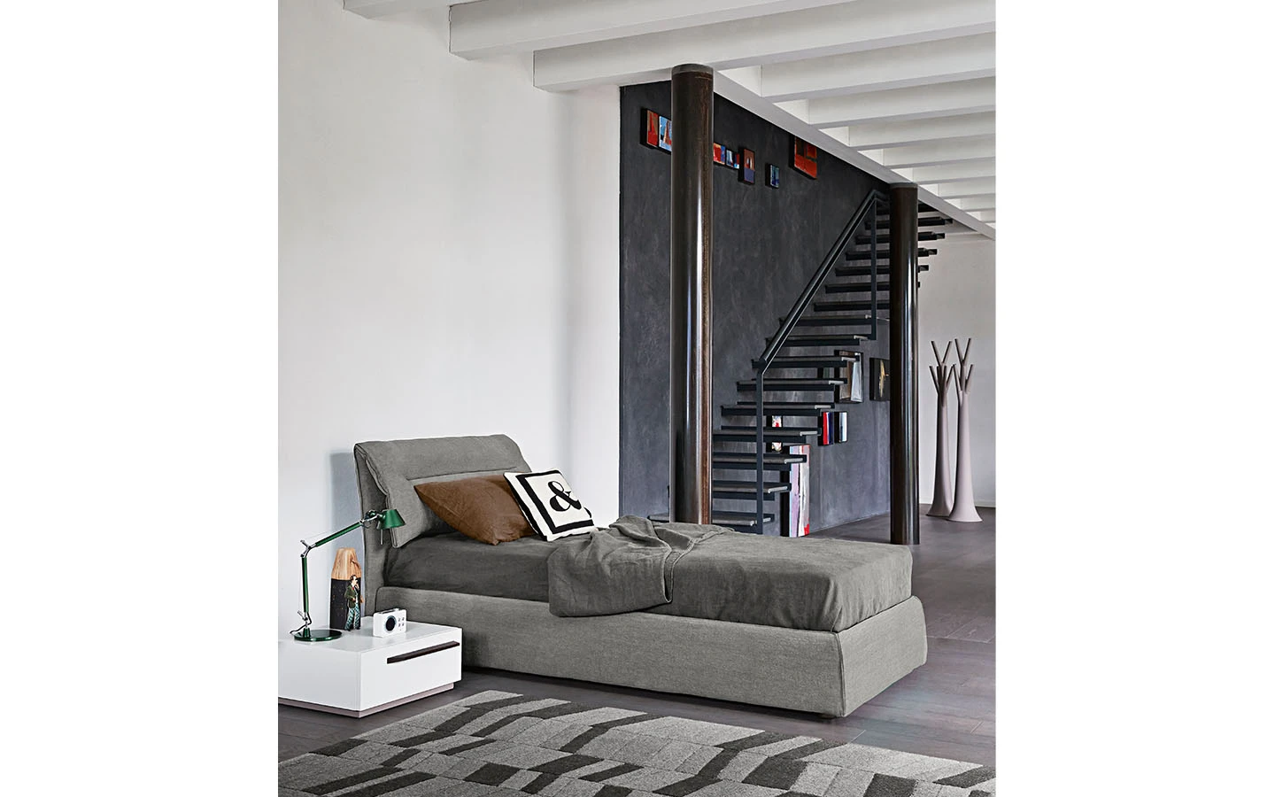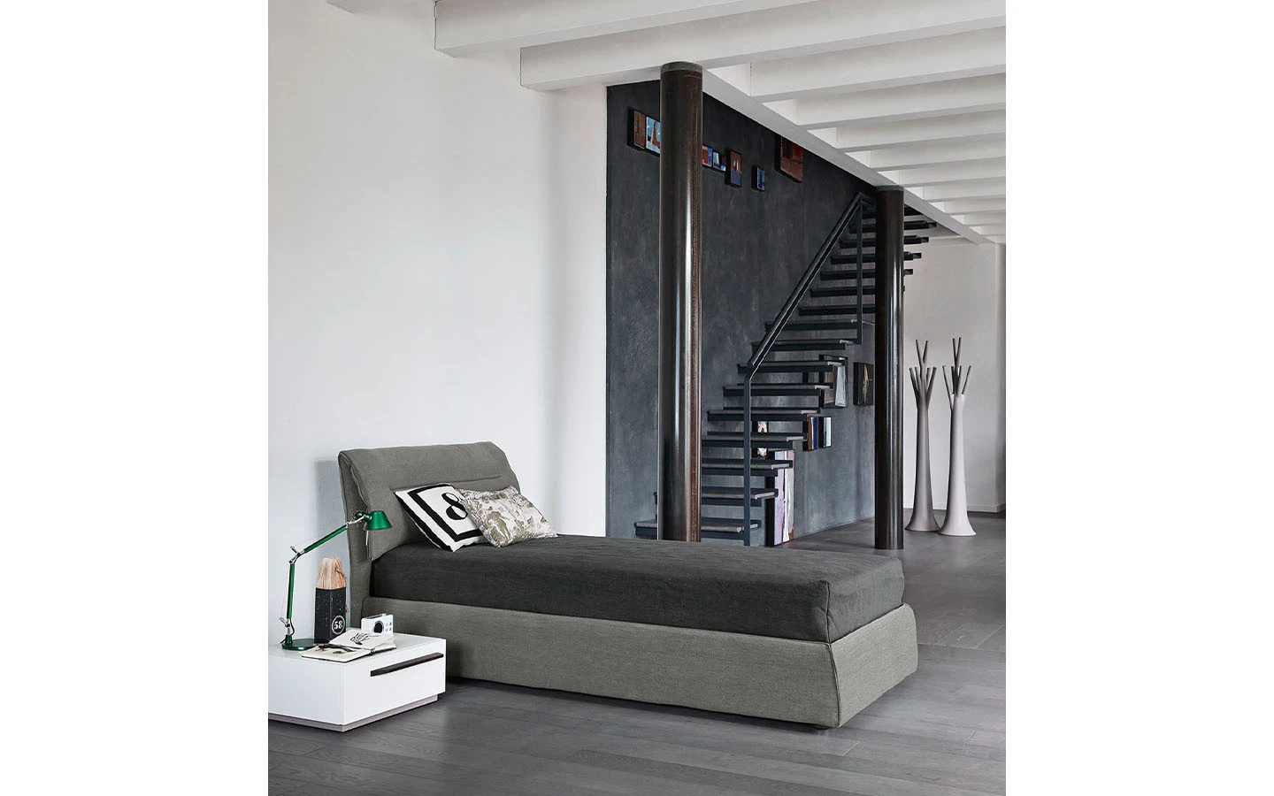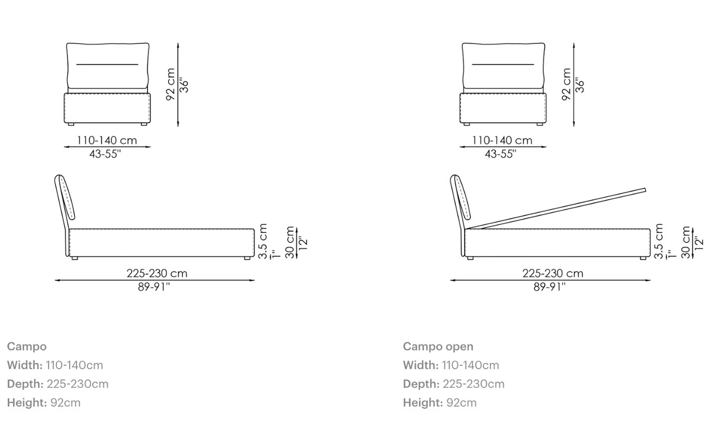 Единичното легло CAMPO се отличава с меката, тапицирана табла, която се адаптира удобно към позите на тялото. CAMPO е изработено от плат, кожа или екокожа и е украсено по краищата с декоративни шевове, които могат да бъдат в тон или в контраст с тапицерията, която е напълно сваляема. Във версията с място за съхранение (CAMPO OPEN) се осигурява ценно допълнително пространство за съхранение на калъфки, възглавници и всичко необходимо за спалнята.
