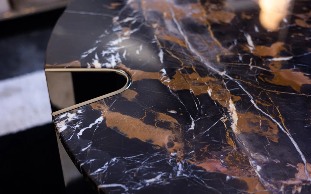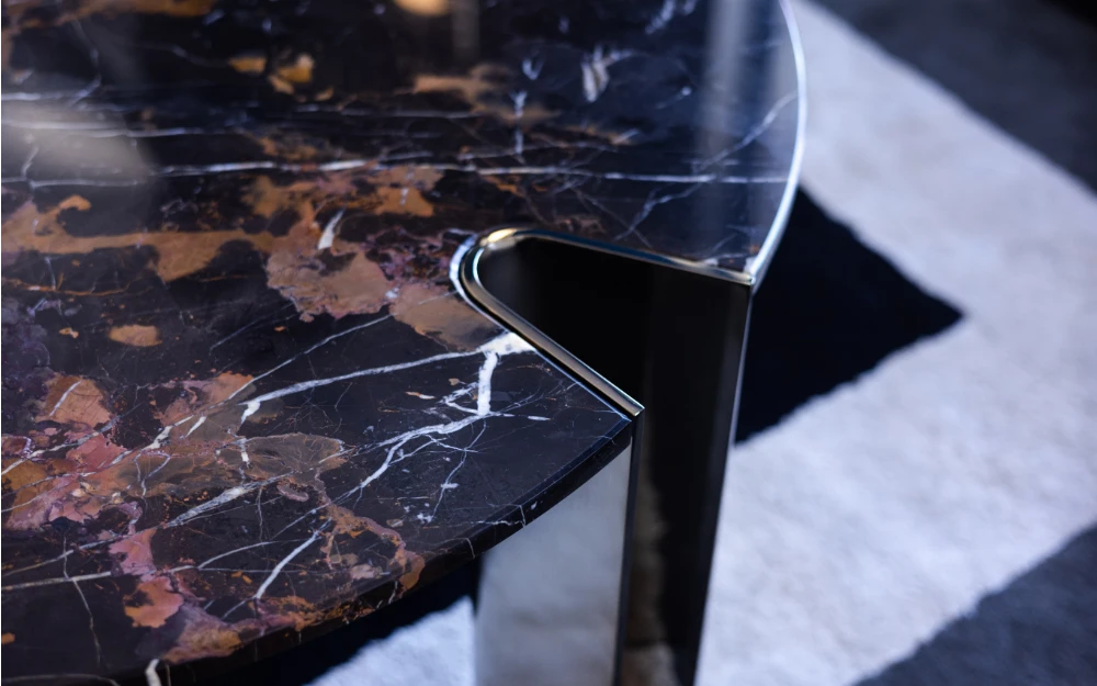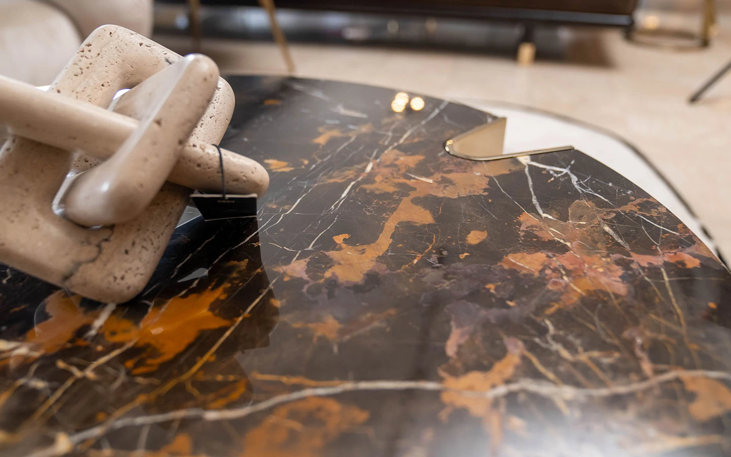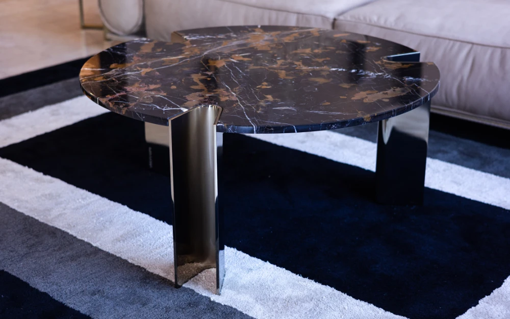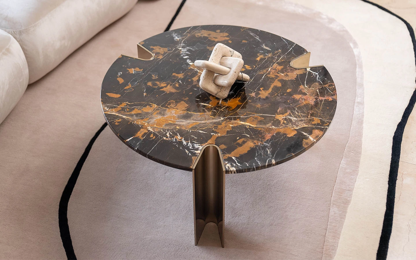 Елегантната ниска маса EGMONT от VISIONNAIRE е с плот от естествен мрамор Black & Gold. Масата е с крака от огънат метал във финиш Gold.