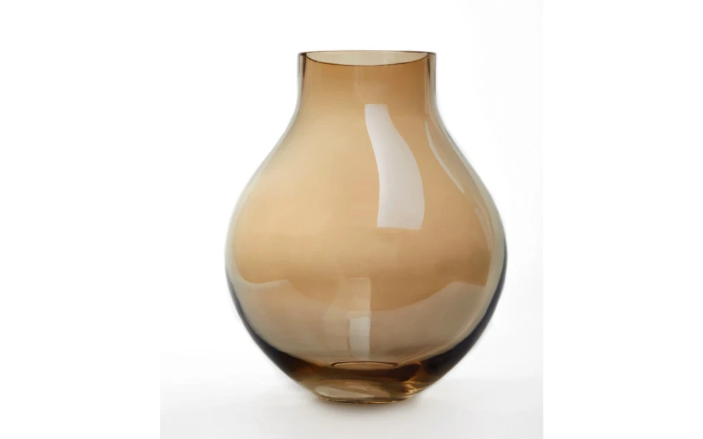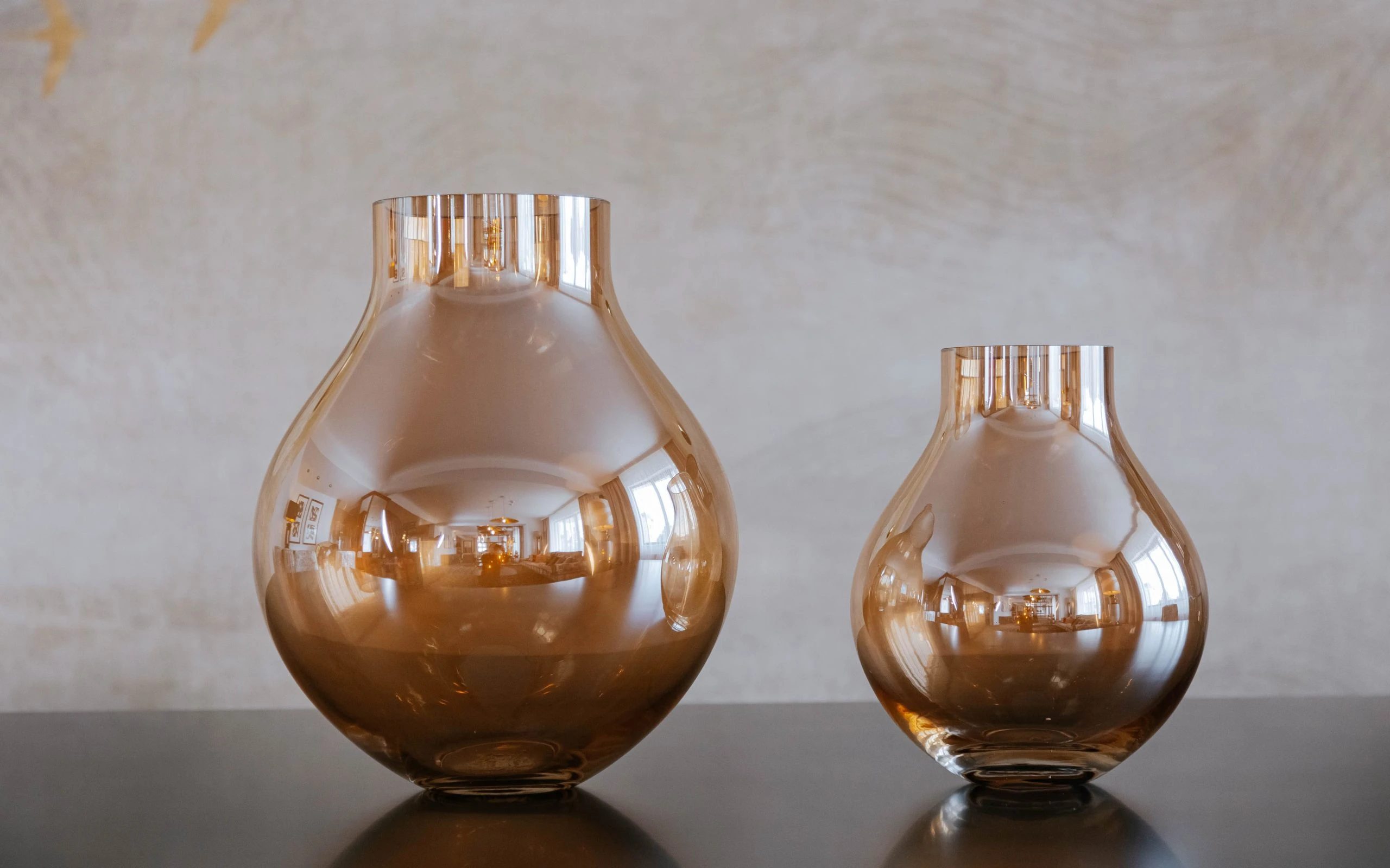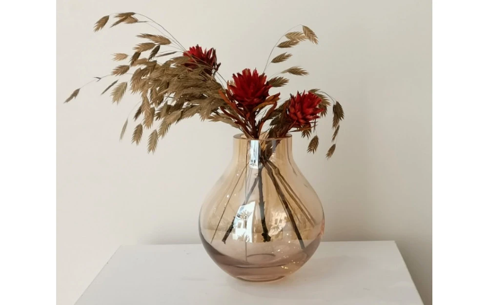 Декоративна ваза от метализирано стъкло в цвят светъл амбър. Детайлите и извивките на вазата я правят съвършена. Тя се вписва във всеки дом – от класически до модерен, чиста елегантност.