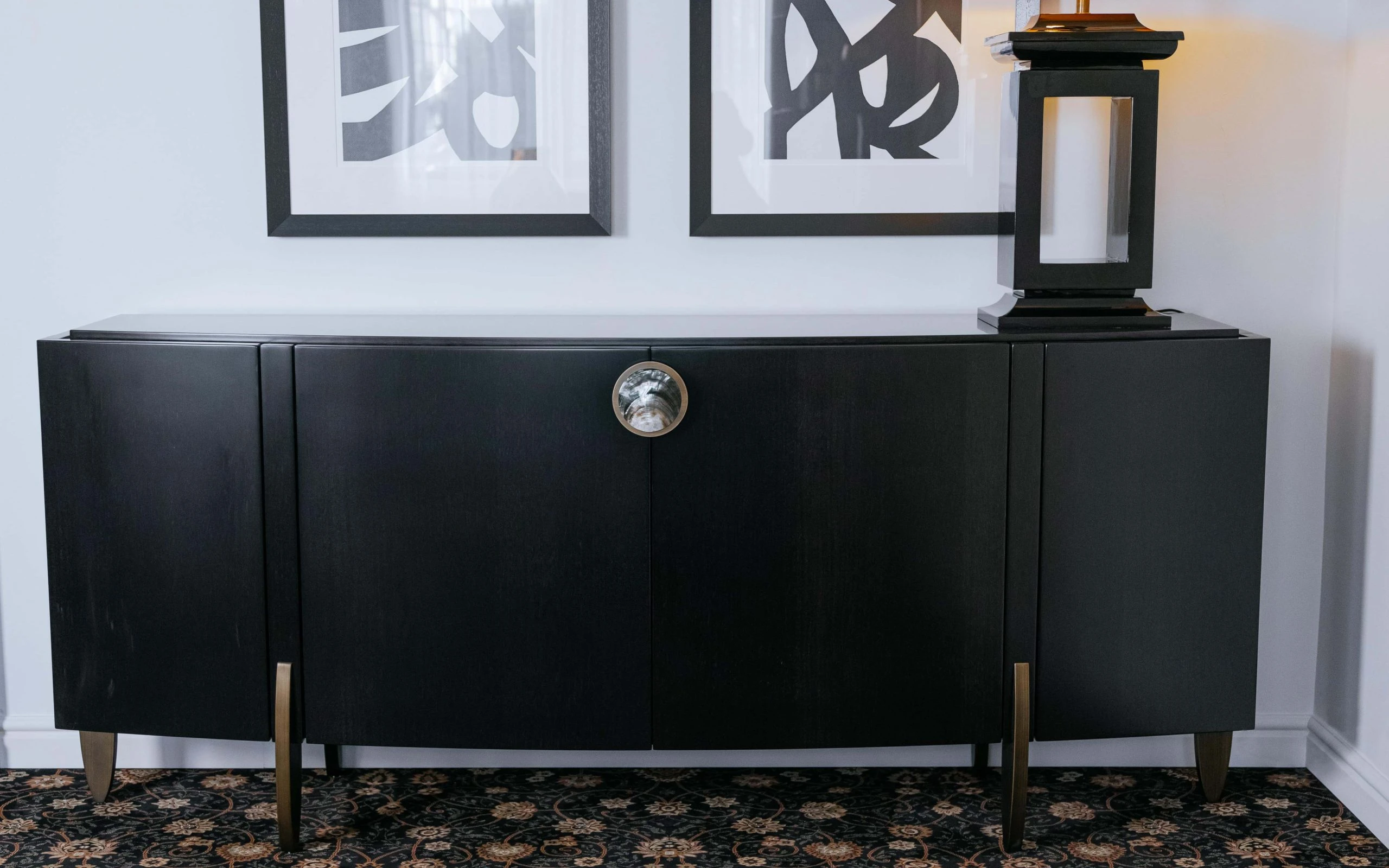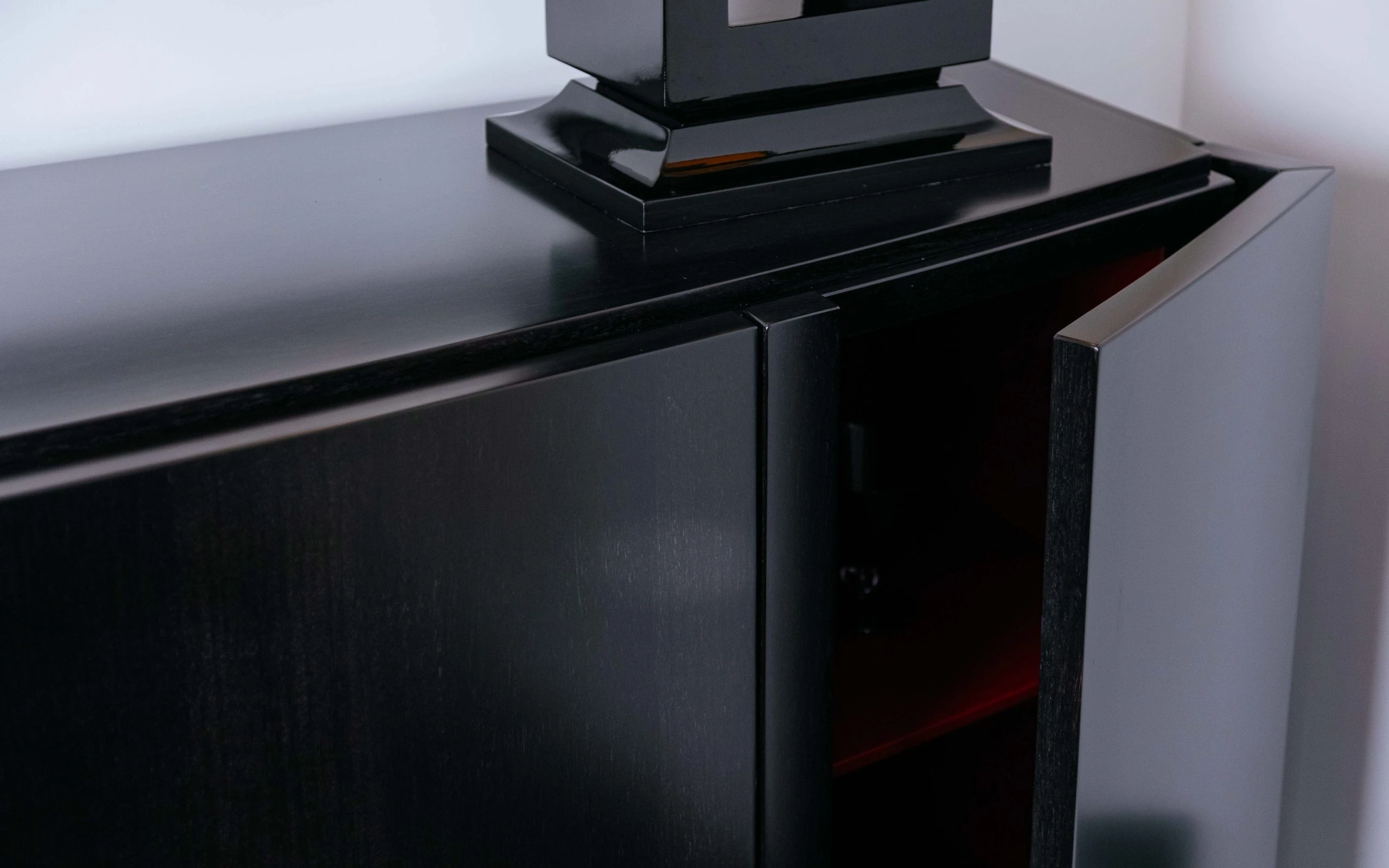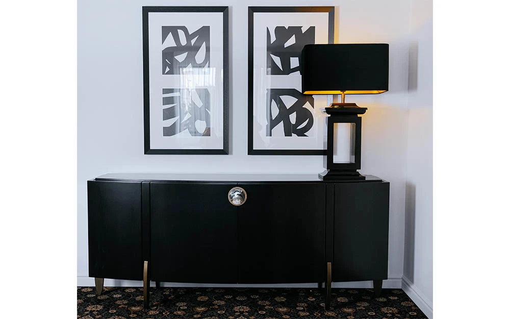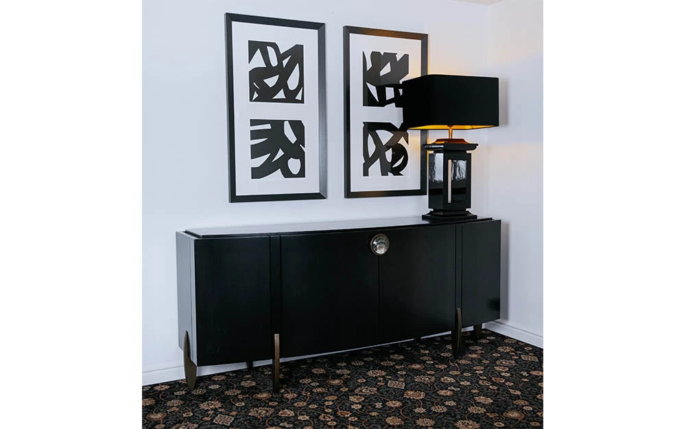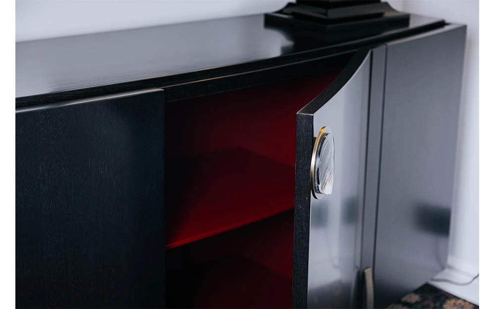 Трапезарният шкаф FASHION AFFAIR BUFFET е от колекцията на италианския производител MALERBA. Две централни и две странични врати. Покритие на плот, врати и страници – естествен фурнир от бразилски орех в копринено матов финиш. Финиш на вътрешността на шкафа – мат лак червен цвят. Бюфетът за всекидневната е оформен с извити линии. FASHION AFFAIR BUFFET е усъвършенстван от ексклузивни метални аксесоари. Дръжката от естествен седеф се съчетава и с крачетата с бронзово покритие, за да завърши елегантно изделието.